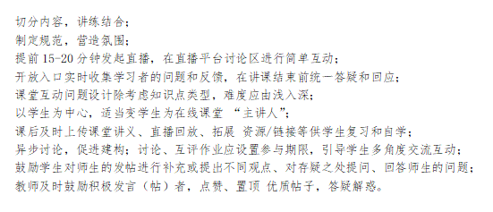 新一轮疫情期间的线上教学,罗一鸣教授总结出了以下五个特点:一是“老师的教”和“学生的学”不贯通。直播时学生是否在线认真,听课须不时关注和促进。二是教、学过程的相互作用弱化,使得学习效果更取决于学生的意志力和自主学习能力。三是教的作用不在于内容是否完整呈现,而在于是否促进和帮助学生学习的真正发生。四是教学实施过程高度依赖信息平台技术的支持以及优质的教学资源。五是此轮线上教学学生大都在学校,便于开展小组学习和讨论。