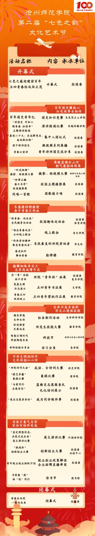 本届文化艺术节活动时间为5月1日——5月31日,以“青春永向党,一起向未来”为主题,以“展现青春风采,碰撞思维火花,放飞青年梦想,打造特色品牌”为目标,以健康向上、丰富多彩的大学生科技文化艺术活动为载体,开设“百年团史耀我心,红色故事永相传”“筚路蓝缕壮山河,朝气蓬勃结硕果” “冬奥精神燃激情,奋斗青春正热血” “精雕细琢夺天工,志存高远增斗志” “生命不息多姿彩,学无止境强技能” “中华文明润环宇,文化传扬沁心田” “书读万卷气自华,苦功百倍终有成”7大板块,开展13项校级活动、16项院级活动,全面落实立德树人根本任务,持续发挥第二课堂育人功能,突出办学特色。该活动既是营造良好育人环境和文化氛围的有力抓手,也是我们献礼建团百年,迎接党的二十大胜利召开的重要举措之一。
