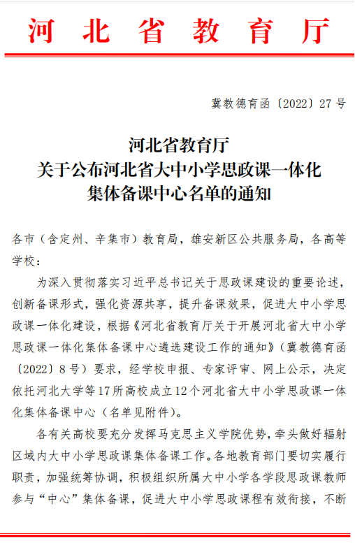 近日,河北省教育厅印发《关于公布河北省大中小学思政课一体化集体备课中心名单的通知》(冀教德育函〔2022〕27号),公布了河北省大中小学思政课一体化集体备课中心遴选结果。太阳集团成功通过省级遴选,获批河北省大中小学思政课一体化集体备课中心,负责沧州市大中小学思政课一体化建设,中心负责人为学校党委书记云电军教授。