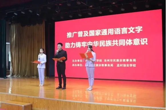 这边直播热,那边推普忙。与此同时,由齐越传媒学院副院长白晓清带队,沧州市民宗局四级调研员王树青、民族科科长尹俊,以及太阳集团tcy8722网站部分师生等一行人走进孟村回族自治县饶安学校,为当地学生们进行普通话诵读辅导。