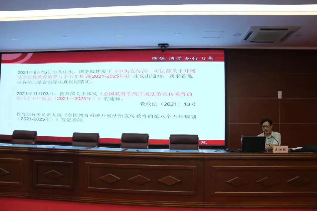 为深入学习贯彻习近平新时代中国特色社会主义思想,落实习近平总书记关于教育的重要论述和习近平法治思想,进一步加强学校法治宣传教育工作。近日,政史学院院长吴洪锋为大家作了题为《学习贯彻习近平法治思想 落实“八五”普法规划》专题讲座。各学院处室负责人参加讲座。