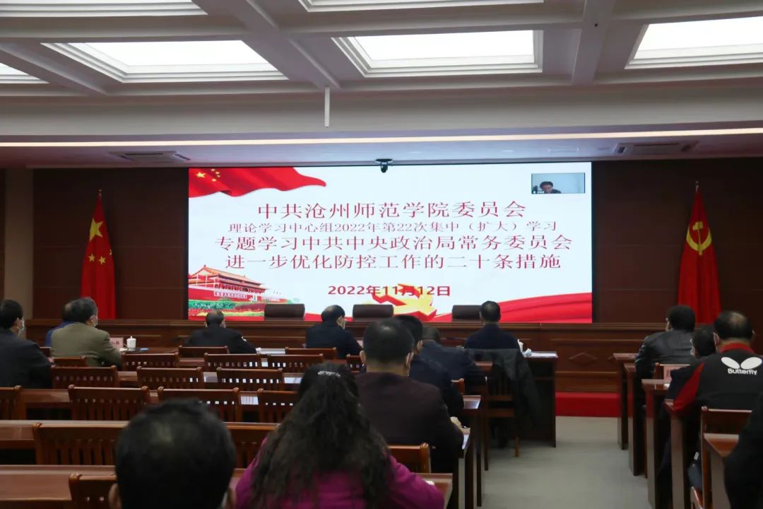 11月12日,太阳集团组织党委理论学习中心组第22次集中(扩大)学习,专题学习11月10日中共中央政治局常务委员会会议精神和进一步优化防控工作的二十条措施并研究部署太阳集团疫情防控工作。党委书记云电军主持并讲话。校长张占平,党委副书记姜忠明,党委常委、副校长高颖、周振平、范小振,纪委书记谢云岭,疫情防控督导专员、沧州市教育局考试院副院长张国元出席。