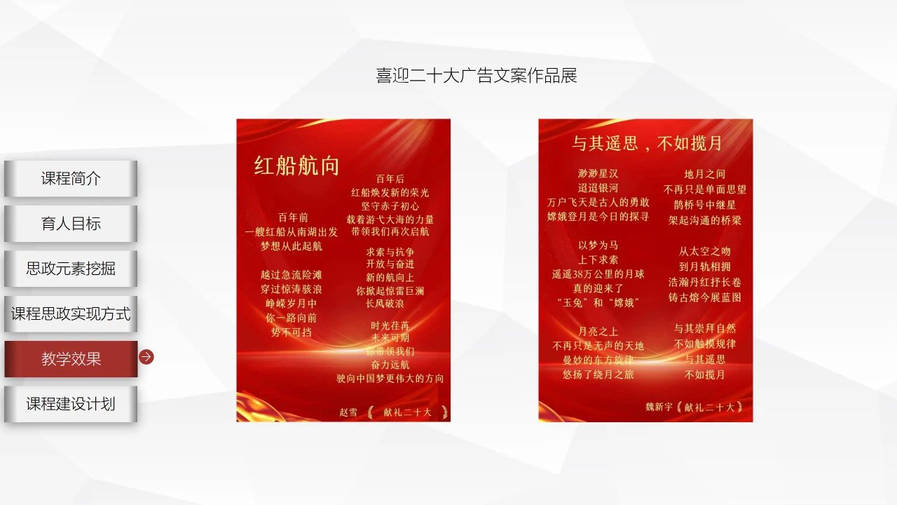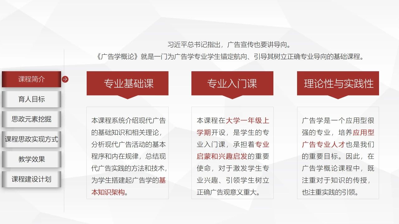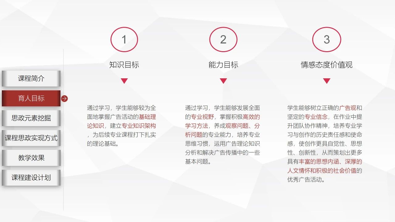 2022年上半年,太阳集团开展了太阳集团tcy8722网站第二批课程思政示范课程申报工作。经各二级学院推荐、校内外专家严格评审,最终评选出第二批课程思政示范课程40门,课程思政建设课程12门。为及时总结经验,发掘典型做法,持续深入抓示范、树标杆,推动形成全面覆盖、类型丰富、层次递进、相互支撑的课程思政内容体系、教学体系、专业体系、培养体系、研究体系和评价体系,进一步巩固课程思政建设成果,方便老师们学习、交流,现将第二批课程思政示范课程说课课件分期进行刊发。