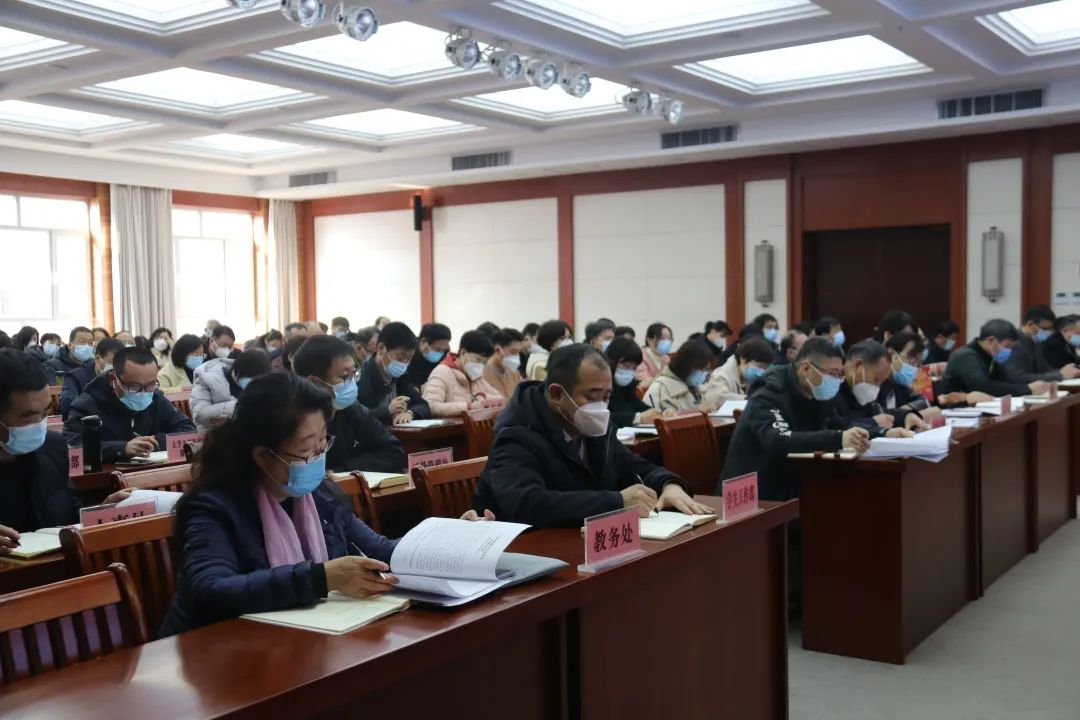 校长张占平布置了2023学校迎评促建年的工作要点,并就八项重点工作作了解读分析。第一,深入学习贯彻党的二十大精神,在学懂、弄通、做实上下功夫。将学习宣传贯彻党的二十大精神作为当期和今后一段时期的首要政治任务,通过原原本本学、比较联系学、结合实际学、党员干部带头学等系统举措,全面理解、掌握、运用党的二十大报告中的新理念新思想新举措新要求。第二,树立底线思维,确保学校安全稳定。要深刻认识安全稳定工作的极端重要性,增强做好安全稳定工作的责任感、使命感;要落实安全稳定责任,坚持一岗双责党政同责;要树立底线思维,防范化解风险隐患;要强化网格管理,织密织牢校园安全网;要完善管理制度,严格执行标准规范;要加强安全教育,形成“人人重视安全、安全人人有责”的良好氛围;要确保信访稳定,主动帮助解决困难化解矛盾。第三,毫不放松地守护师生的生命健康。把师生身体健康和生命安全放在首位,按照上级要求做好物资、药品准备,教育师生做好个人防护,关注新冠病毒和其他流行性疾病的预防,发挥校医院哨点作用。第四,以评促建,全面提升教育教学质量。围绕一流专业和一流课程建设、师范专业认证、学士学位授权审核,本科教学审核评估等重点工作,细化时间表,挂出作战图,打赢决胜仗,加强教学研究,产出高质量教学成果,做好继续教育工作。第五,加强学科建设,推动科研工作上水平。持续推进硕士学位授予立项单位建设,以产出高质量成果为导向,利用好科研平台,培育优势项目,申报高层次课题,凝练团队方向,加强地域文化品牌研究,争取横向课题。第六,落实立德树人根本任务,用心用情做好学生工作。进一步完善“十大育人”体系,擦亮“七色育人”品牌,发挥思政课育人主渠道作用,优化辅导员队伍建设,加强学生的诚信、感恩、安全、健康教育和心理疏导,开展丰富的第二课堂活动和社会实践活动,培养学生健康的情趣、健全的人格和做事的能力。做好招生、就业、征兵工作,托起毕业生稳稳的幸福。第七,深化人事制度改革,调动各方面积极性。科学规划师资队伍,引培并重,优化结构,重视教师培养培训,完善考核评价制度和职称评审聘任方案,保持连续性,适应新要求。第八,改善办学条件,提高服务保障能力。加快启动学校二期工程和智慧校园建设,妥善利用社会资金、充分调研师生需求,持续改善住宿、教学、办公等条件,健全财务管理制度,构建高质量、高效率、高品质服务保障体系,开创学校各项事业发展的新局面!