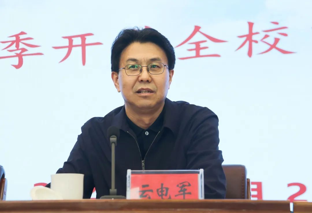 为完成好2023学校迎评促建年的各项工作,云电军提出四点要求:一是站稳人民立场,办好人民满意教育。要坚持党的领导,把牢社会主义办学方向,扎实推进学校治理体系和治理能力现代化,把师范学校特色优势转化为培养社会主义建设者和接班人的强大能力,让党的二十大精神在沧州师院落地生根、开花结果,努力使学校成为沧州最讲政治、最讲忠诚、最讲党性、最讲担当的领跑者。二是聚焦特色优势,打造产学研用高地。深入思考梳理“河北推动什么、沧州需要什么、师院突破什么”,在服务对接京津冀和雄安中加快发展,全力推进硕士学位授予立项单位建设,积极促进产学研深度融合和成果转化,依托大运河文化研究中心,努力实现“活态传承”,擦亮师院名片。三是坚持立德树人,提升人才培养质量。要以大思政体系塑造青年,推动构建政府、社会、学校协同联动的实践育人共同体;要紧跟育人需求,调整、改造、升级传统优势学科和特色专业建设,不断提高人才培养质量;要加强师资队伍建设,教育引导教师做到精通专业知识的“经师”、涵养德行的“人师”、自觉育时代新人的“大先生”。四是抱持乐观心态,激发艰苦奋斗精神。永葆为党育人、为国育才的干事创业初心,在思想上夯实新目标、新使命,在行动上展现新作为、新担当,在工作上彰显新气象、新作风,以饱满的热情、科学的态度、严谨的作风,助推师院这艘航船乘风破浪、行稳致远!