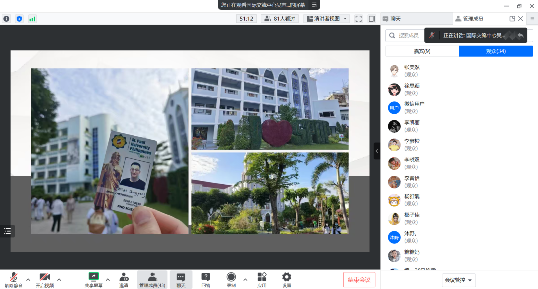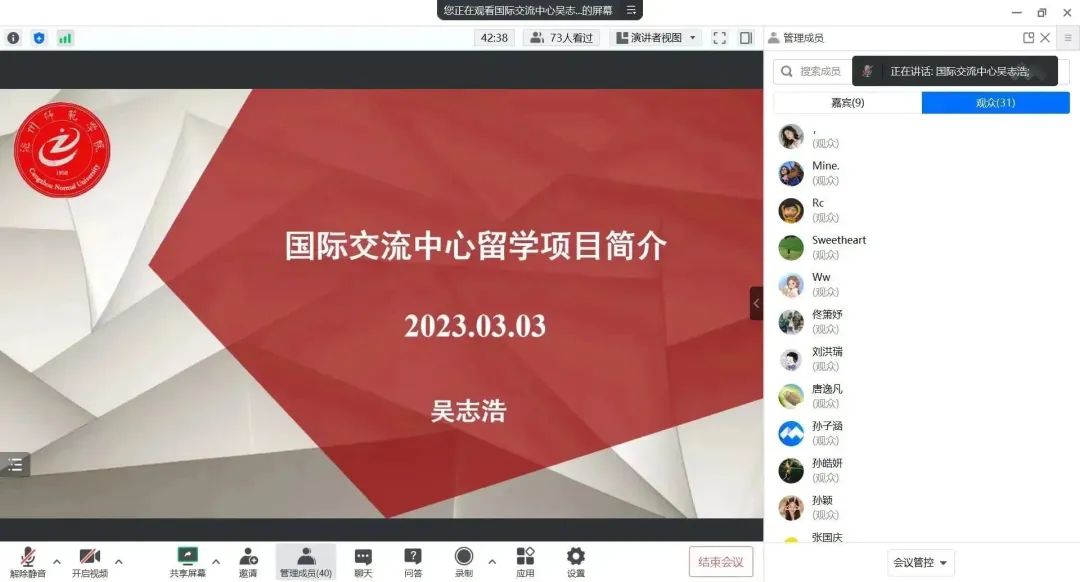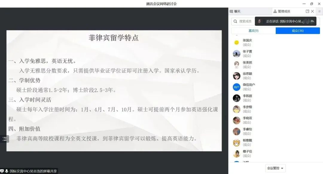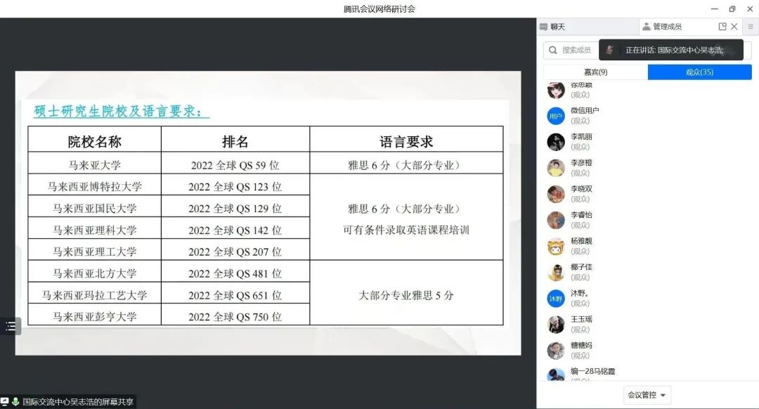 韩丽梅主要针对海外留学在中国的发展阶段进行介绍,让同学们更好地了解海外留学从古至今的发展脉络。她结合自身经验真情实感地鼓励同学们要走出舒适圈,看到更加广阔的世界。随后,吴志浩老师结合图文案例介绍了马来西亚留学特点、硕士研究生院校及语言要求、菲律宾留学特点、韩国全北国立大学、韩国清州大学的实际情况,鼓励同学们接触到不同的文化、不同的学术环境,更重要的是给同学们带来了更多的发展机会。