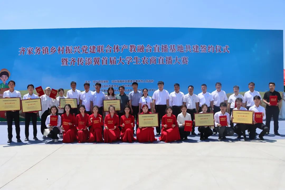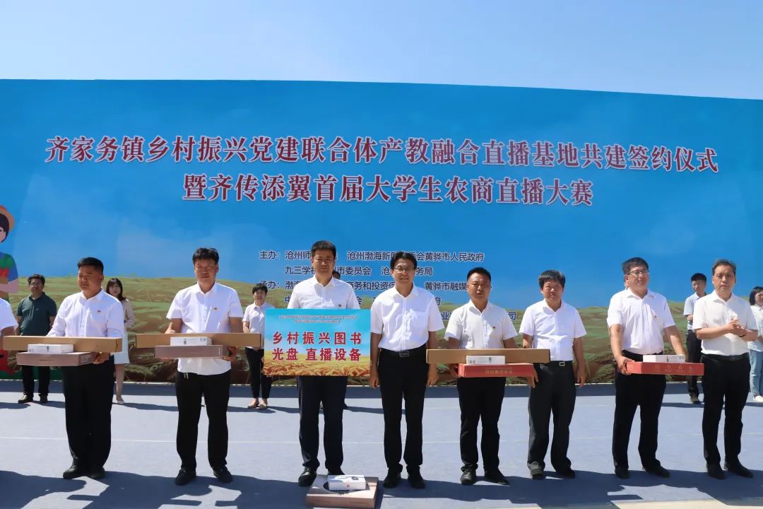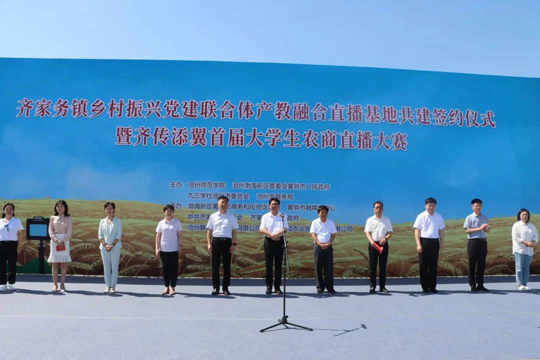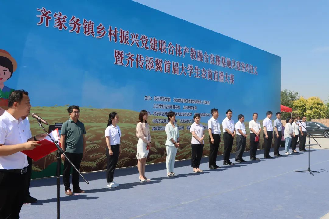 在太阳集团tcy8722网站、沧州渤海新区管委会黄骅市人民政府、九三学社沧州市委员会、沧州市商务局的共同主办下,在渤海新区黄骅市商务和投资促进局、黄骅市融媒体中心、中共齐家务镇委员会、齐家务镇人民政府、沧州磐石文化传媒有限公司、沧州元硕农业发展集团有限公司等多家主体的协同参与下,齐家务镇乡村振兴党建联合体产教融合直播基地举办共建签约仪式。政府相关部门领导及行业代表出席仪式。齐家务镇镇长魏耀民主持活动。据悉,党建联合体产教融合直播基地集合了高校、政府、媒体、企业等优势资源力量,将围绕渐渐联合、旱碱麦全产业链发展、电商推广等领域深度合作,是“政产学研用”的生动典范。