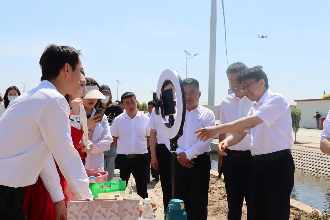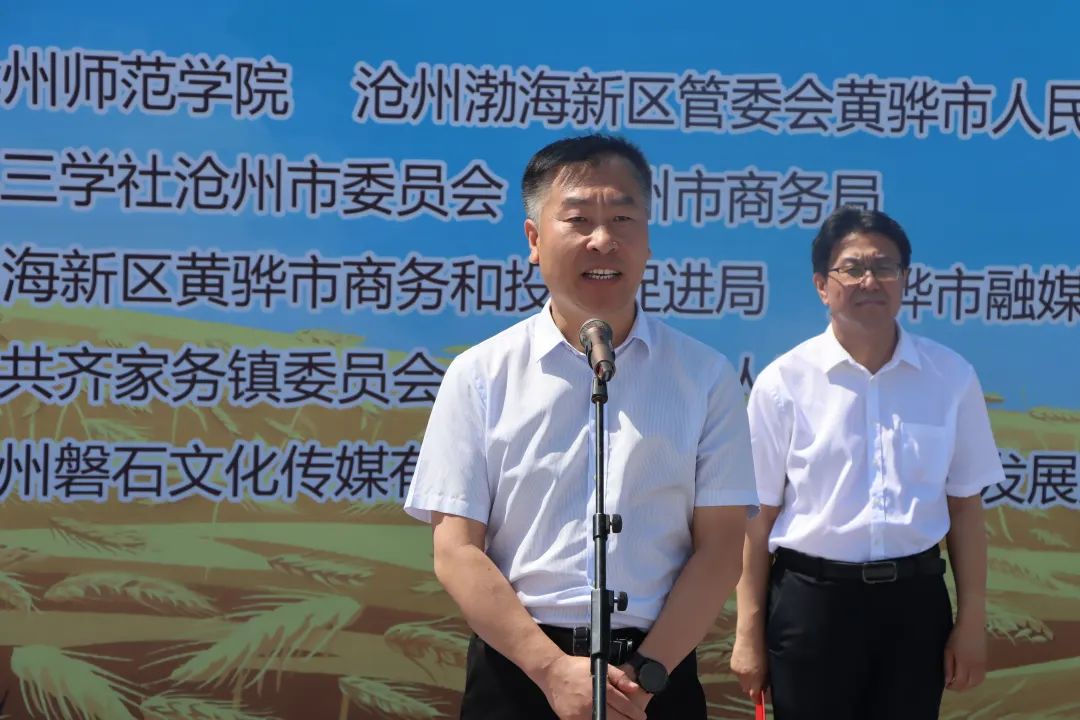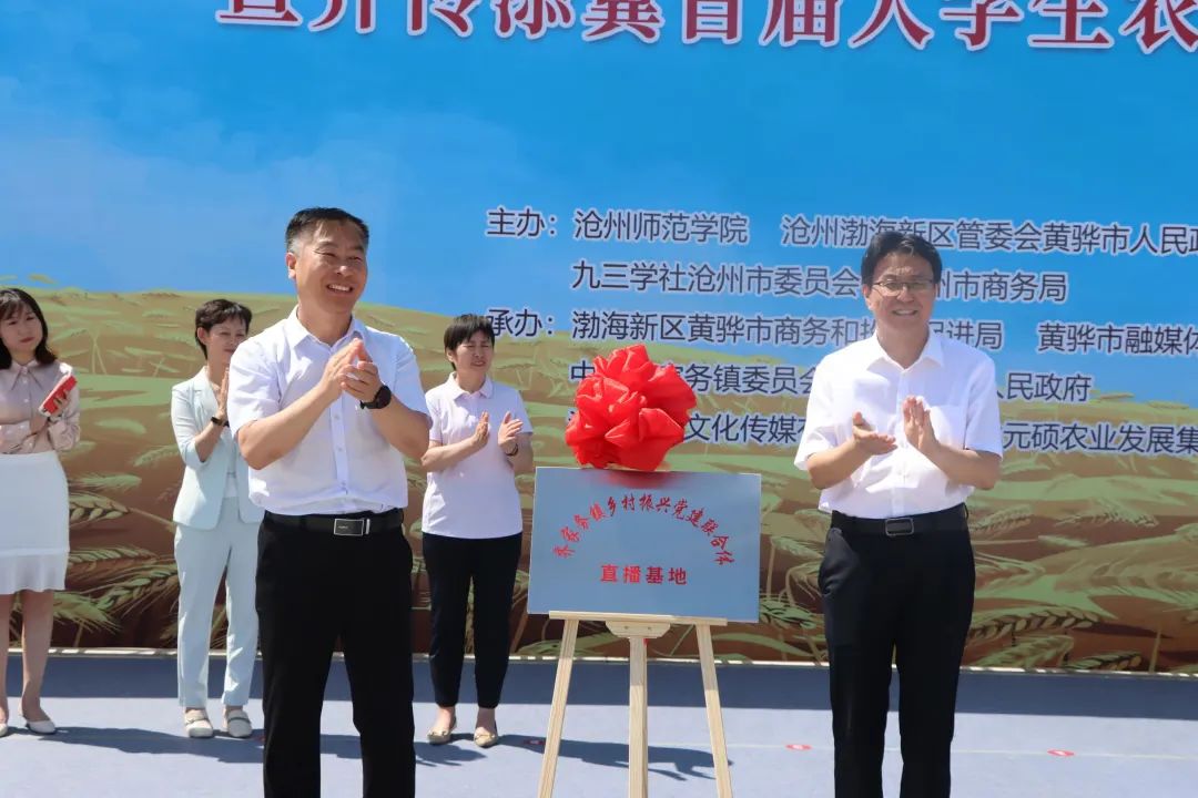 校党委书记云电军,沧州渤海新区党工委、黄骅市委副书记屈国治为“齐家务镇乡村振兴党建联合体直播基地”“齐传添翼大学生农商直播实践基地”揭牌。