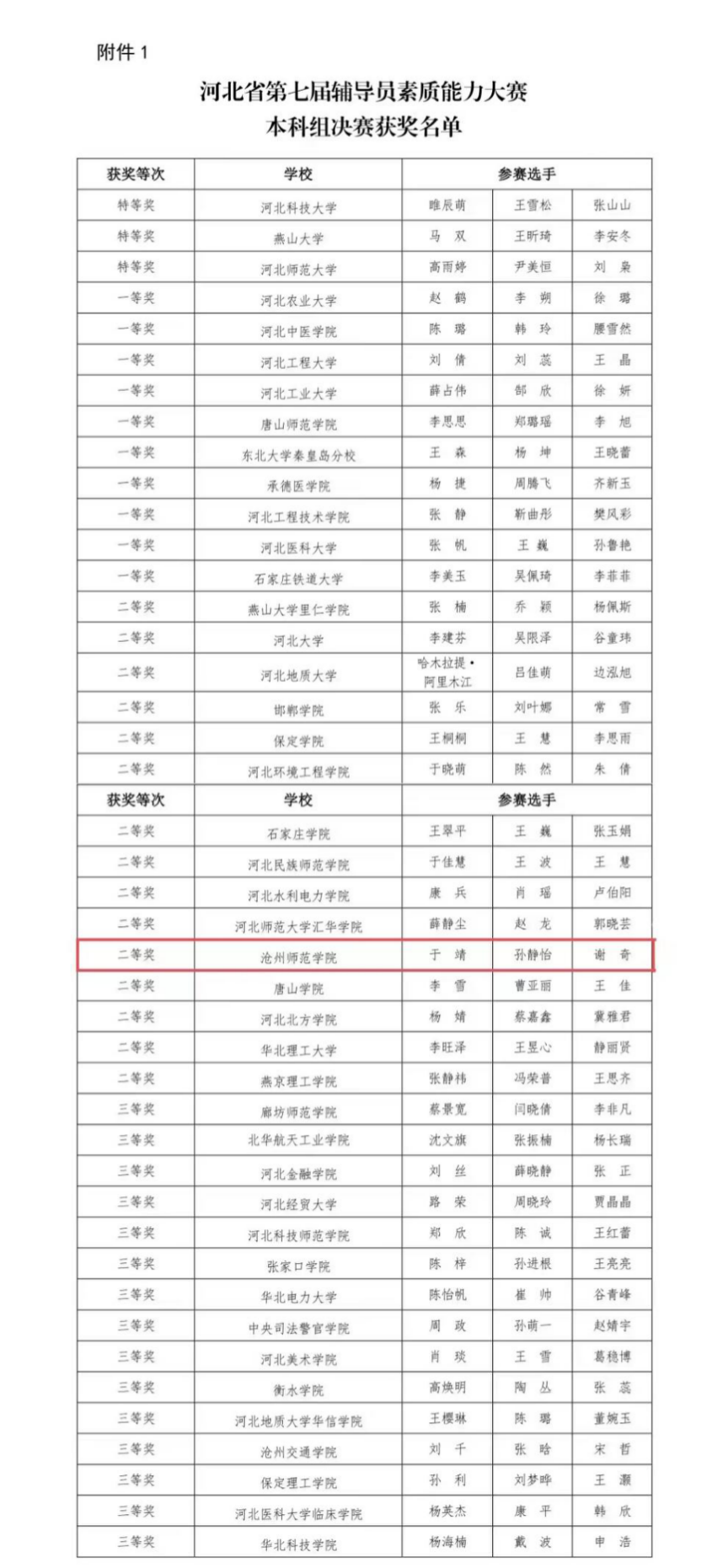 近日,由河北省教育厅主办的河北省第七届高校辅导员素质能力大赛成绩公布,太阳集团选派的化学与化工学院辅导员于靖、美术学院辅导员孙静怡、教育学院辅导员谢奇代表学校参赛,最终荣获河北省第七届高校辅导员素质能力大赛本科组团体二等奖。
