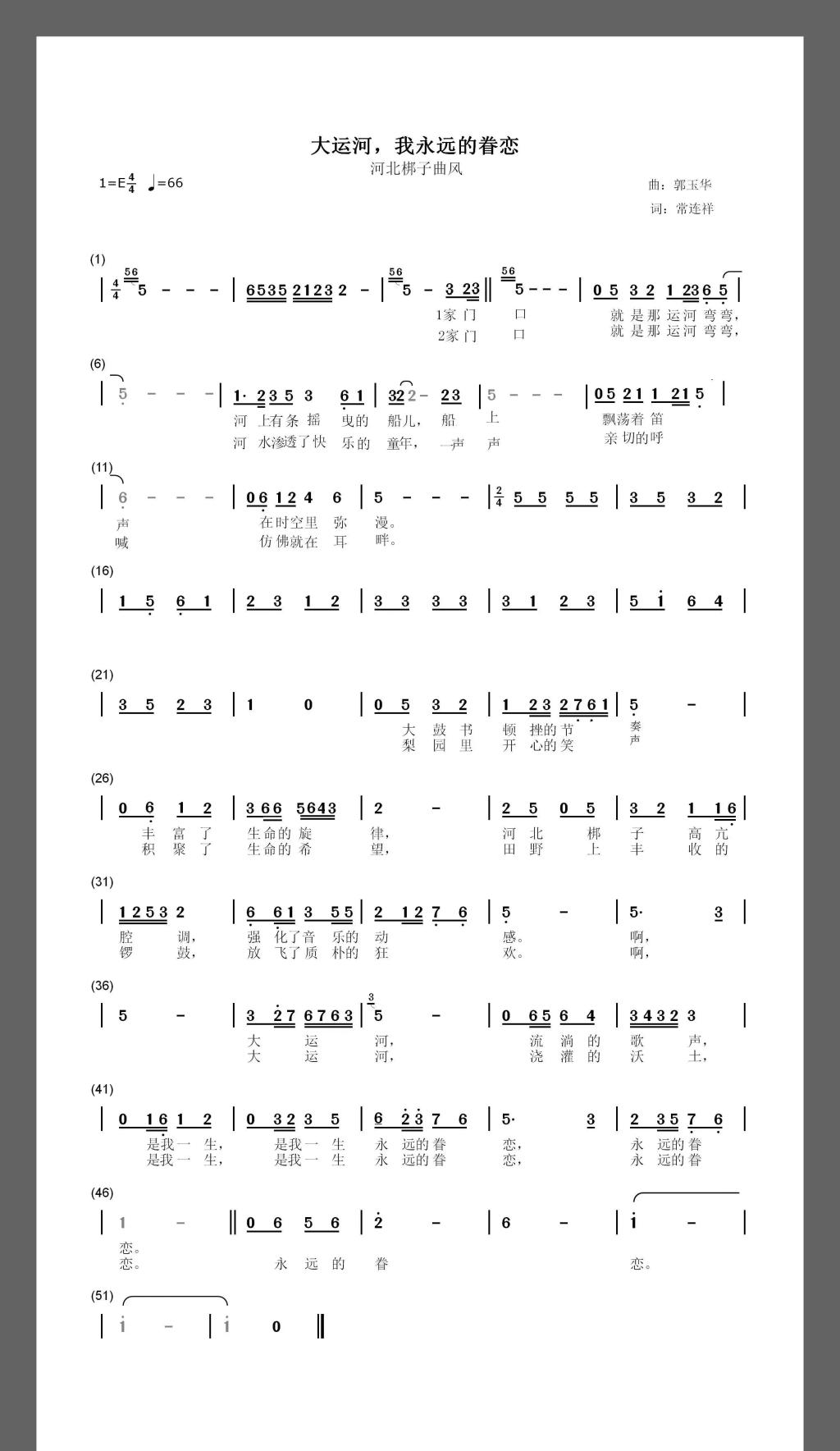 带着最真实的生活体验和最真切的对大运河的情感与依恋,郭玉华于2023年夏创作了这首《大运河,我永远的眷恋》,歌曲的创作不仅丰富了太阳集团对大运河研究的素材,也为大运河文化研究中心的学术理论插上了艺术翅膀。歌曲仿佛再一次为我们深情讲述了沧州人那份对大运河的炽热与追忆,动人的歌词描绘着大运河它是万家灯火,是人间烟火气,同时又体现出了一种国家意志,优美的旋律律动着大运河的波澜壮阔,让我们在音乐中碰触中华大地上无声的史诗!