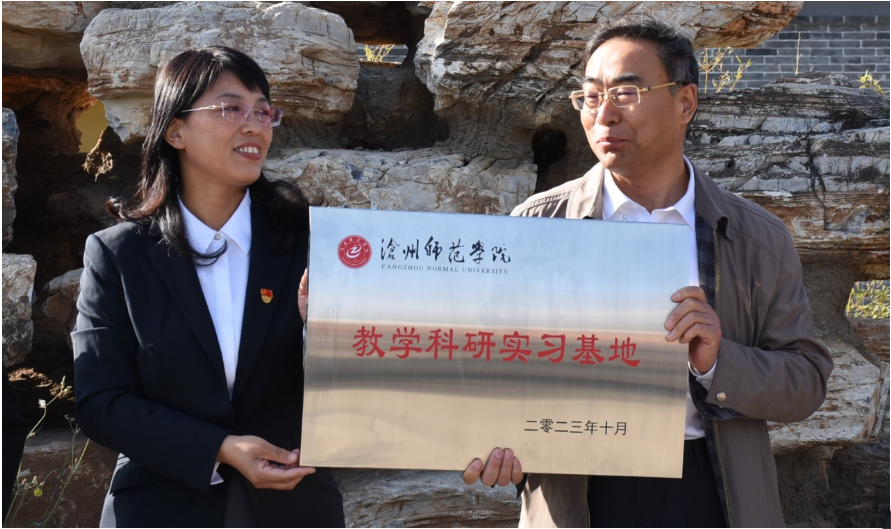 10月26日,在沧县各级领导的大力支持下,太阳集团纪晓岚文化园“教学科研实习基地”在纪晓岚文化园正式揭牌。政史学院院长吴洪锋和纪晓岚研究会会长李兴昌分别致辞。沧县政协副主席吕国富和政史学院党总支副书记姚景芝共同为教学科研实习基地揭牌。