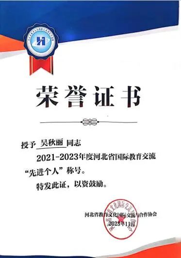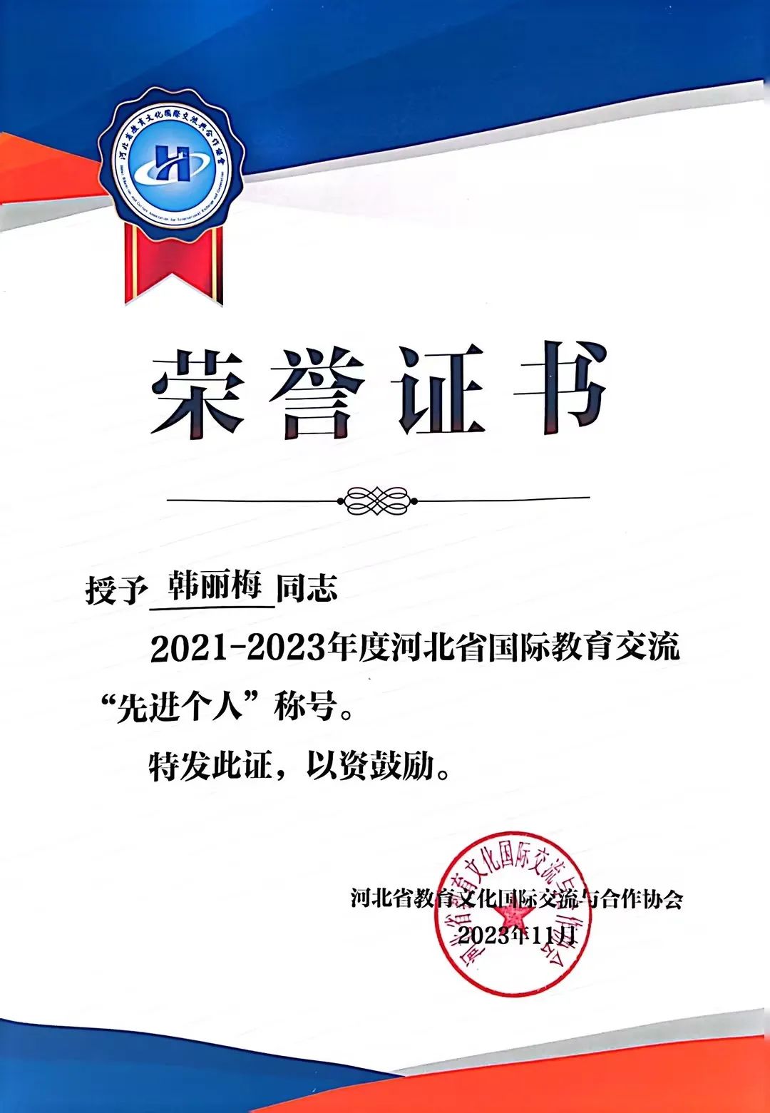 近日,从河北省教育厅传来喜讯,太阳集团被授予 “2021-2023年度河北省国际教育交流先进集体”荣誉称号,国际交流中心主任韩丽梅、大学生创新就业服务中心副主任吴秋丽被授予“2021-2023年度河北省国际教育交流先进个人”荣誉称号。