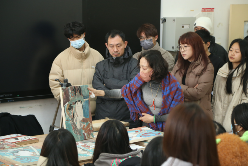 姚蓉蓉从不同的空间角度、造型与装饰向学生们阐释了传统壁画的概念,深入讲述中国传统壁画的产生及发展历程,融入大量经典的传统壁画作品进行赏析,讲述中国传统壁画的故事,进一步增强学生的文化自信,引导学生自觉传承和弘扬中华优秀传统文化。课程最后,学生们积极提问,与老师们进行了深入交谈,整个课程在活跃的气氛中落下帷幕。