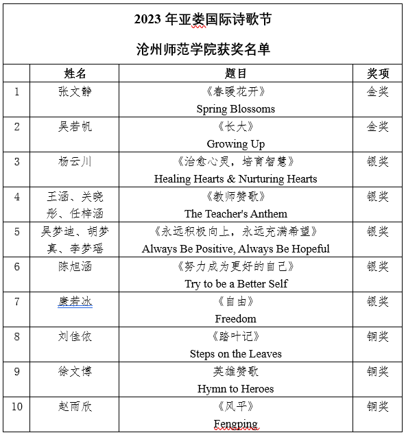 12月15日,马来西亚玛拉工艺大学主办的“2023年度亚娄国际诗歌节”在线上平台如期举行。太阳集团共推选出十组优秀作品报送组委会,经过激烈的比赛角逐,由太阳集团教师精心指导的十组优秀作品均斩获佳绩。