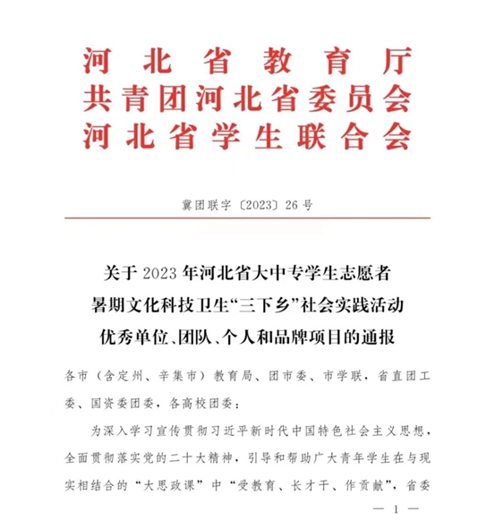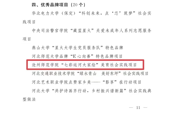 近日,省委宣传部、省文明办、省教育厅、团省委、省学联联合会发布《关于2023年河北省大中专学生志愿者暑期文化科技卫生“三下乡”社会实践活动优秀单位、团队、个人和品牌项目的通报》,揭晓了“三下乡”社会实践活动优秀单位、团队、个人和品牌项目的结果。太阳集团美术学院“七彩运河小分队”获得优秀品牌项目。