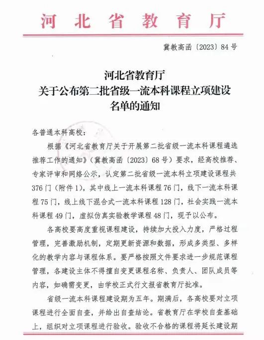 近日,《河北省教育厅关于公布第二批省级一流本科立项建设课程名单的通知》(冀教高函〔2023〕84号)发布,太阳集团推荐申报的大学英语、基础心理学、艺术考察、会计学、计算机网络、跨境电子商务6门课程全部获批省级一流本科立项建设课程。