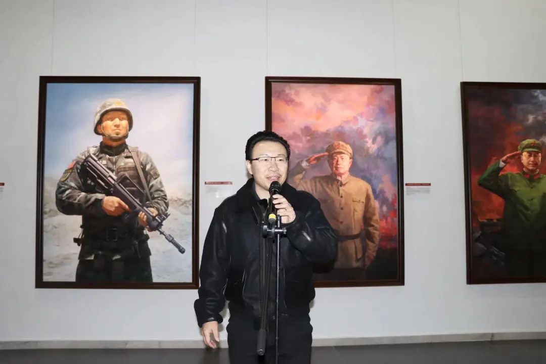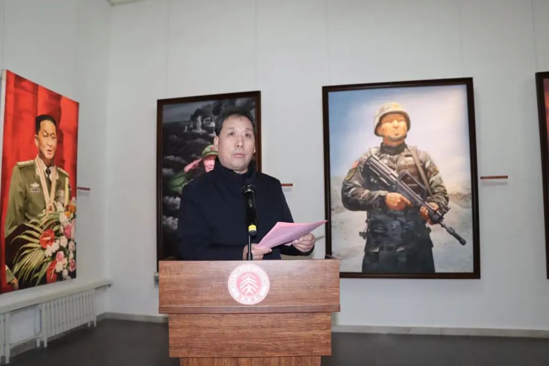 邢树军在致辞中表示,时代造就英雄,新时代呼唤英雄,传承英雄精神是落实习近平文化思想中“坚持培育和践行社会主义核心价值观”重要论述的具体实践。本次画展以“为英雄造像,为时代讴歌”主题,汇聚了美术学院师生和校外优秀画家的100余幅精品力作, 是在“七一勋章”获得者先进事迹进课堂的基础上进行成果扩大化,将五章一簿中的共和国勋章、八一勋章、友谊勋章和国家荣誉称号等共百位勋章获得者收录进绘画作品,旨在通过艺术的视角和表现形式,深入贯彻落实党的二十大精神,引导广大党员干部和群众更加深入地领会习近平新时代中国特色社会主义思想的深刻内涵和实践要求。希望广大师生永远学习传承英雄精神,歌颂美好新时代,以昂扬的姿态投入到学校高质量发展和建设中,为加快建设教育强国、科技强国、人才强国,为加快建设现代化经济强市、美丽沧州作出新的更大贡献!