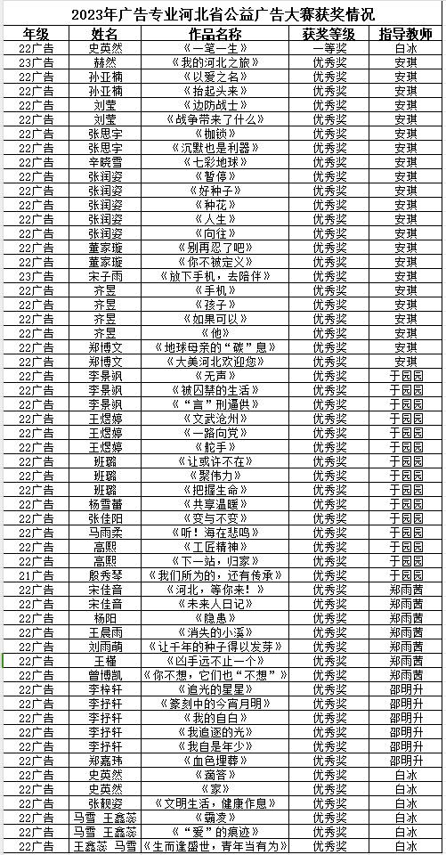 赛事成绩的取得离不开广告学专业本学期开设课程《广告文案写作》的创新实践。课程坚持思政引领,以赛带训,依托河北省公益广告大赛和学院奖等广告专业赛事进行文案创作训练,本学期除河北省公益广告大赛之外,还参加了在广告学界享有盛名的“创意星球学院奖”,获得优秀奖5项,入围奖16项。2022年该门课程获得河北省公益广告大赛三等奖2项,优秀奖30项;学院奖优秀奖24项,入围奖12项,教学成果斐然。