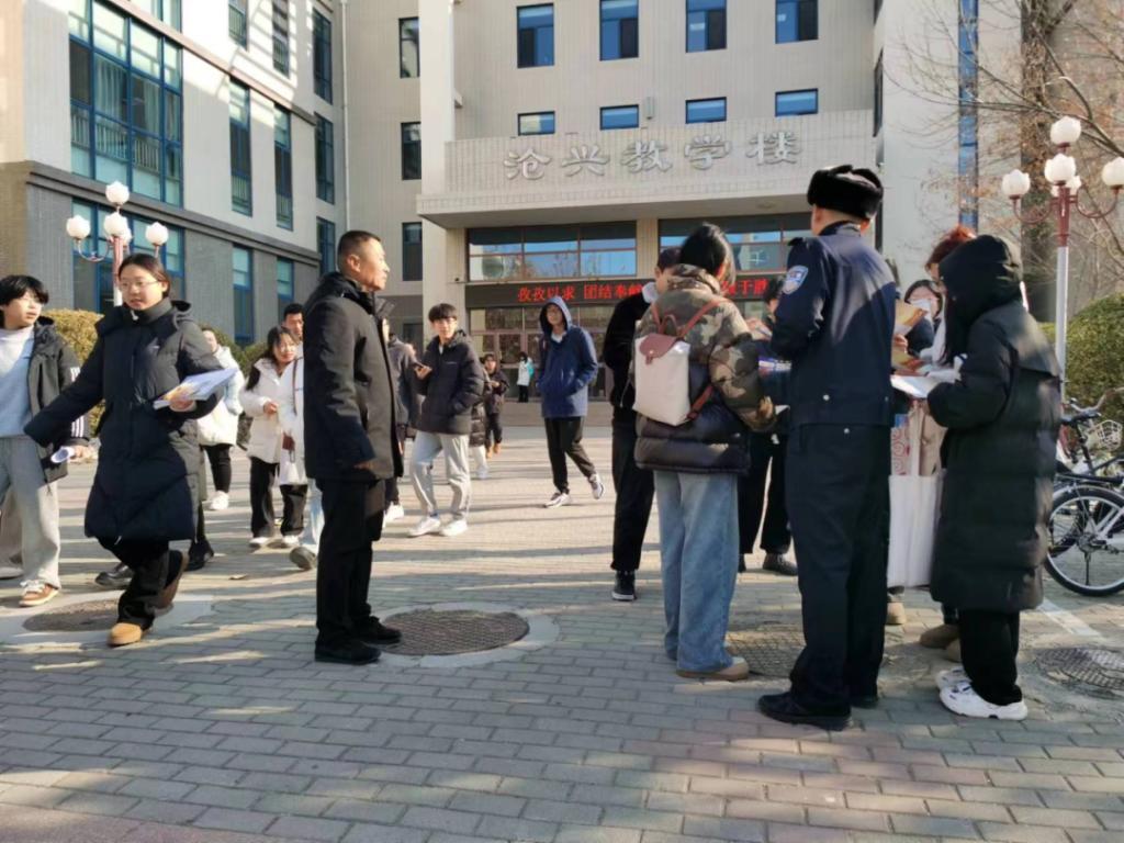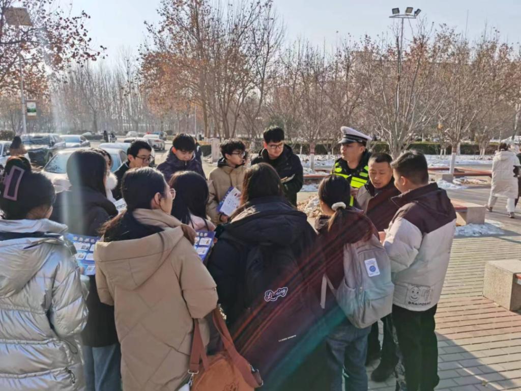在1月10日“中国人民警察节“来临之际,沧州市公安交警支队一大队民警张振德和三大队民警李正阳一行联合太阳集团tcy8722网站安全工作处一起对校园师生进行交通安全知识和反诈骗宣传,散发宣传材料。
