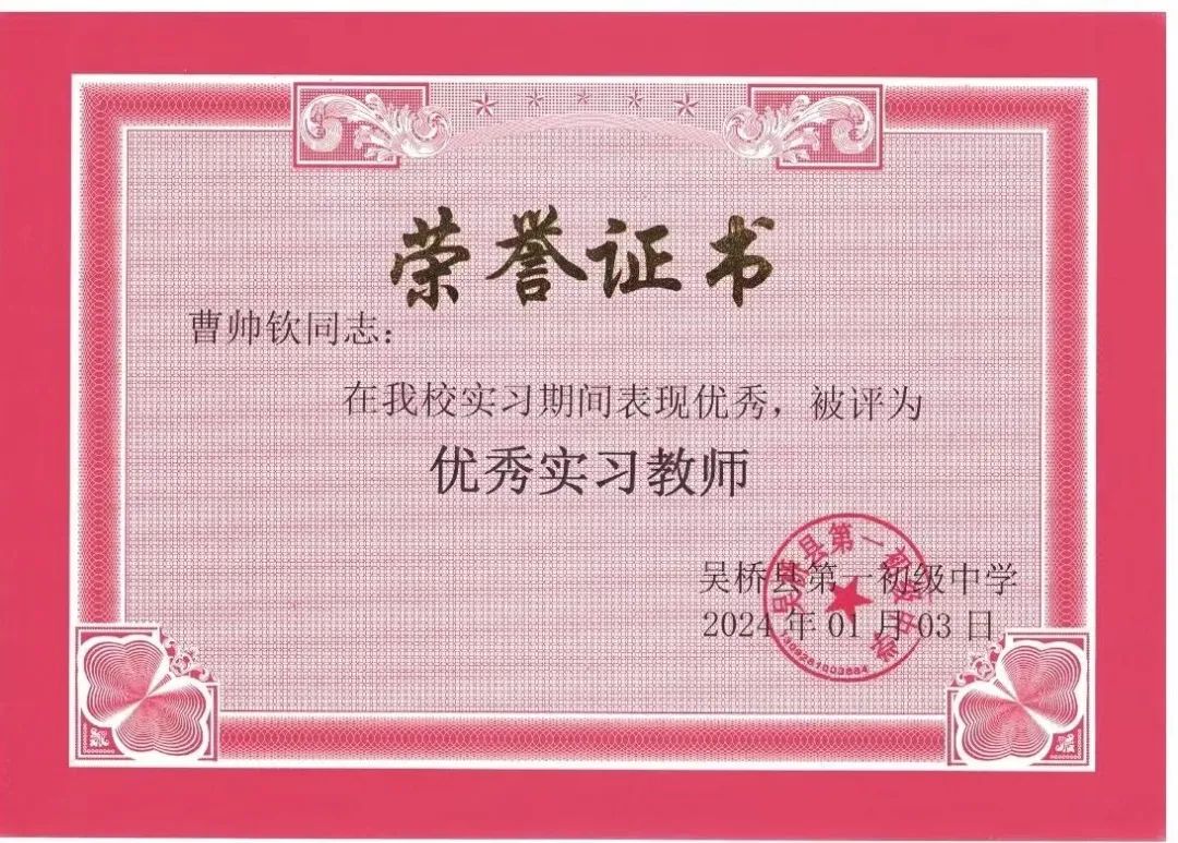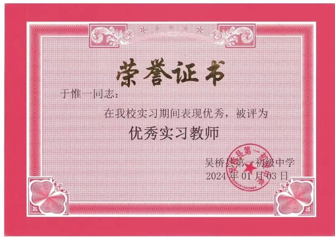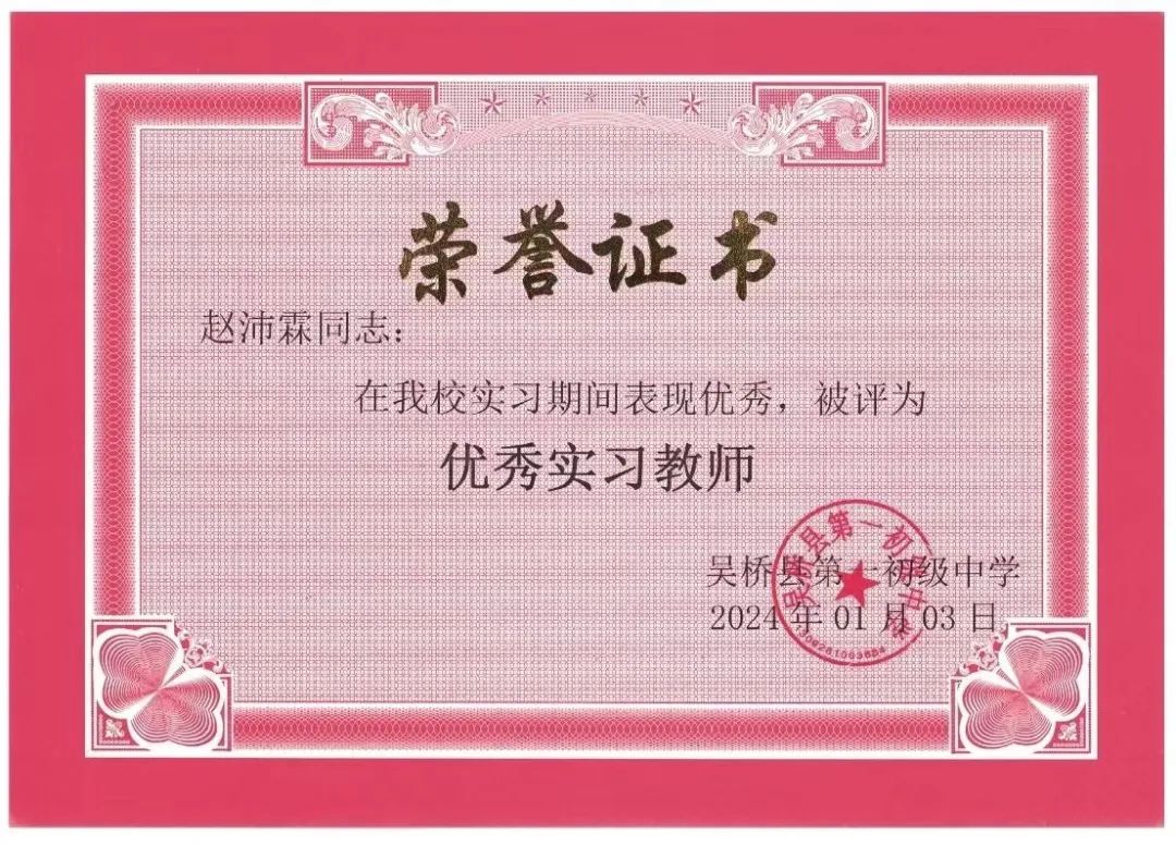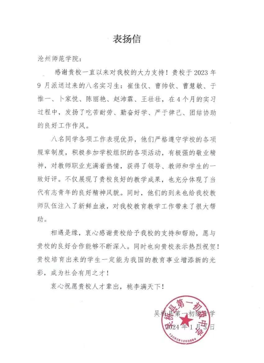 1月7日,吴桥县第一初级中学校长李世芳、副校长周霞向太阳集团专门寄达一封表扬信和八张“优秀实习生”荣誉证书,对太阳集团派驻的全体八名实习生给以表扬。
