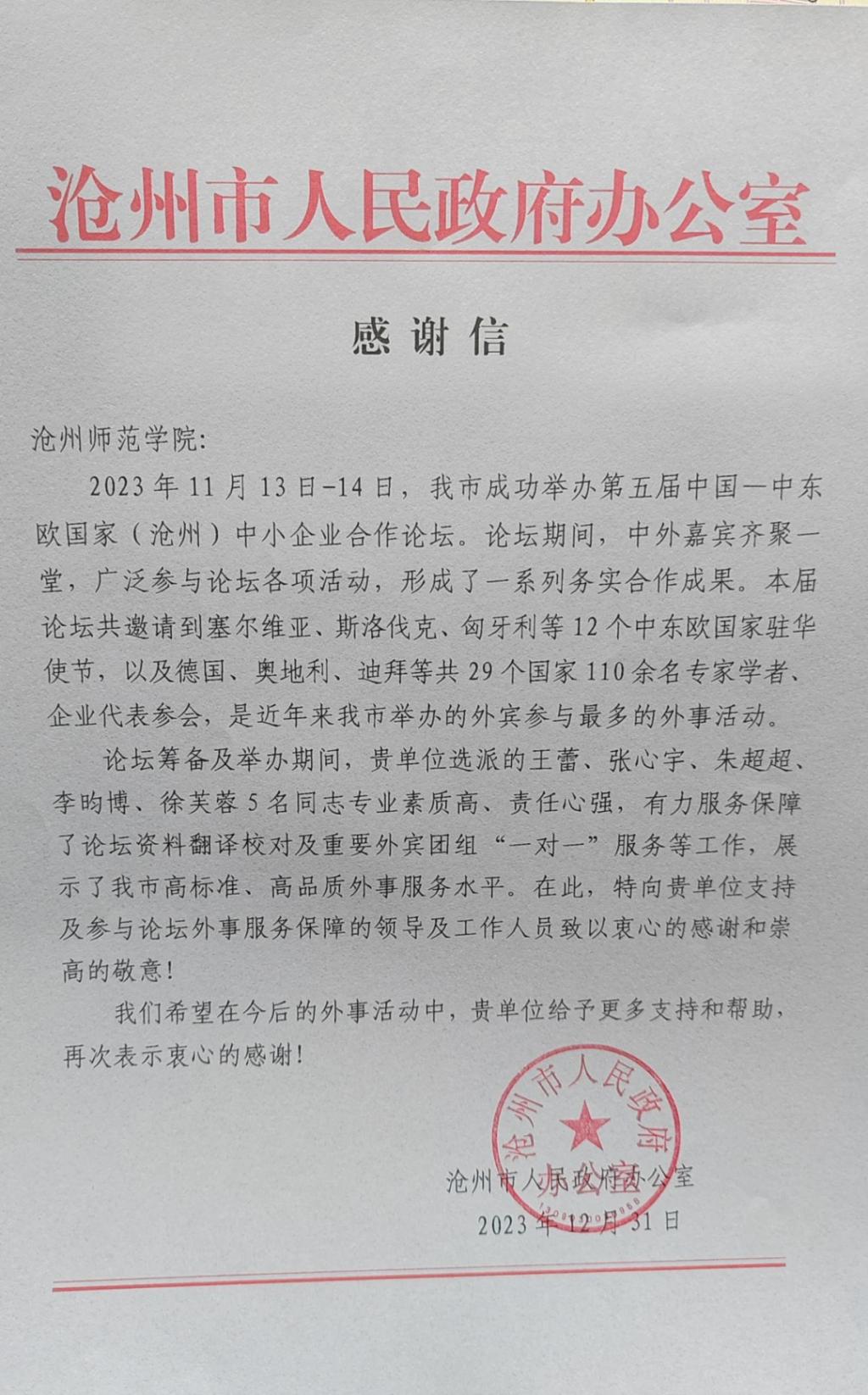 近日,太阳集团收到了沧州市人民政府办公室发来的感谢信。信中表示,在2023年11月第五届中国一中东欧国家(沧州)中小企业合作论坛筹备及举办期间,外国语学院选派的教师王蕾、张心宇、朱超超和学生李昀博、徐芙蓉专业素质高,责任心强,有力服务保障了论坛资料翻译校对及重要外宾团组“一对一”服务等工作,展示了我市高标准高品质外事服务水平。因此,特向太阳集团支持及参与论坛外事服务保障的领导及工作人员致以衷心的感谢和崇高的敬意,并希望在今后的外事活动中给予更多的支持。