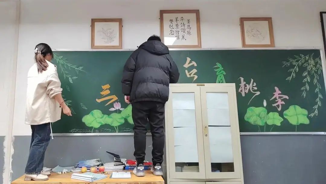 轮台县第一中学的文化底蕴深厚,每个办公室都具有自己独特的文化魅力。刘凡所在的八年级年级部是一个极富书卷气、美学气息的小家庭,办公室以年轻人居多,总是充满了欢声笑语。他们是工作间隙能拿起吉他弹一曲,为大家解乏的同事,也是天天逗趣抛梗接梗的同事,更是工作时严肃认真一丝不苟的同事。在学校举办的办公室文化装饰展示活动中,不仅采用花草来装点办公室,更在墙上挂了艺术画作、书法长卷,办公室前后两块大黑板,书写着同事们的师道追求。记得装点两块黑板时已经下班很久了,但各位老师都不约而同地留了下来,画画写字分工明确,配合默契。那天放着音乐随性创作的场景,让刘凡记忆犹新。