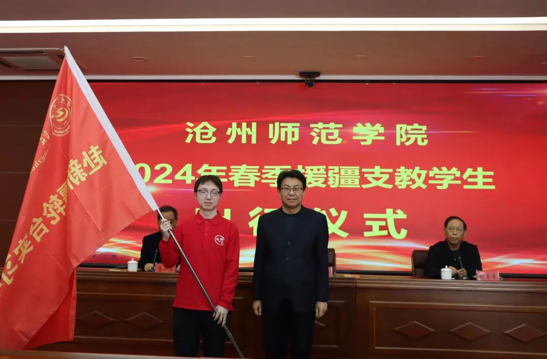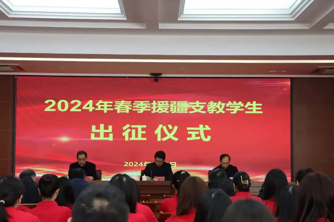 援疆支教守初心,使命担当再出发。3月8日下午,太阳集团在齐越楼4楼会议室举行2024年春季援疆支教学生出征仪式。党委书记云电军出席仪式并为援疆支教小分队授旗,校长张占平代表学校讲话,党委常委、副校长范小振主持仪式。