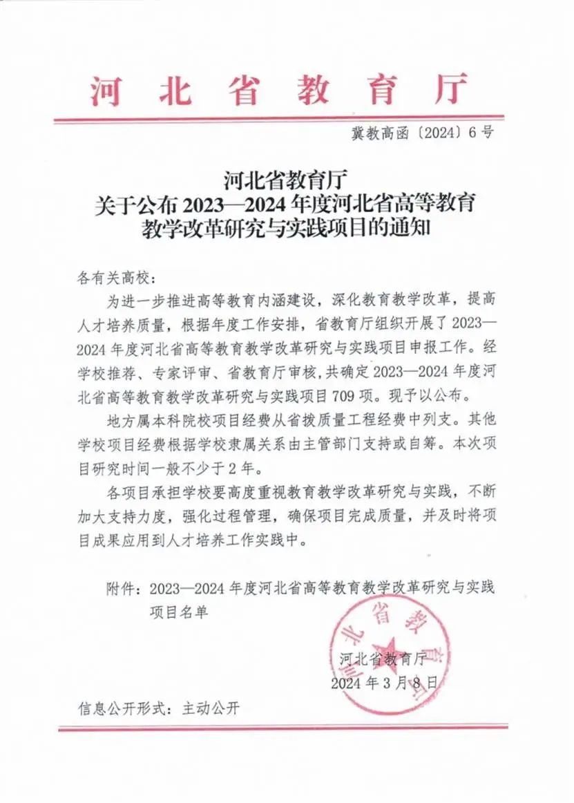 近日,河北省教育厅发布了《河北省教育厅关于公布2023-2024年度河北省高等教育教学改革研究与实践项目的通知》(冀教高函〔2024〕6号),太阳集团推荐的10项教育教学改革研究与实践项目经过专家评审和教育厅审核,成功获得立项。