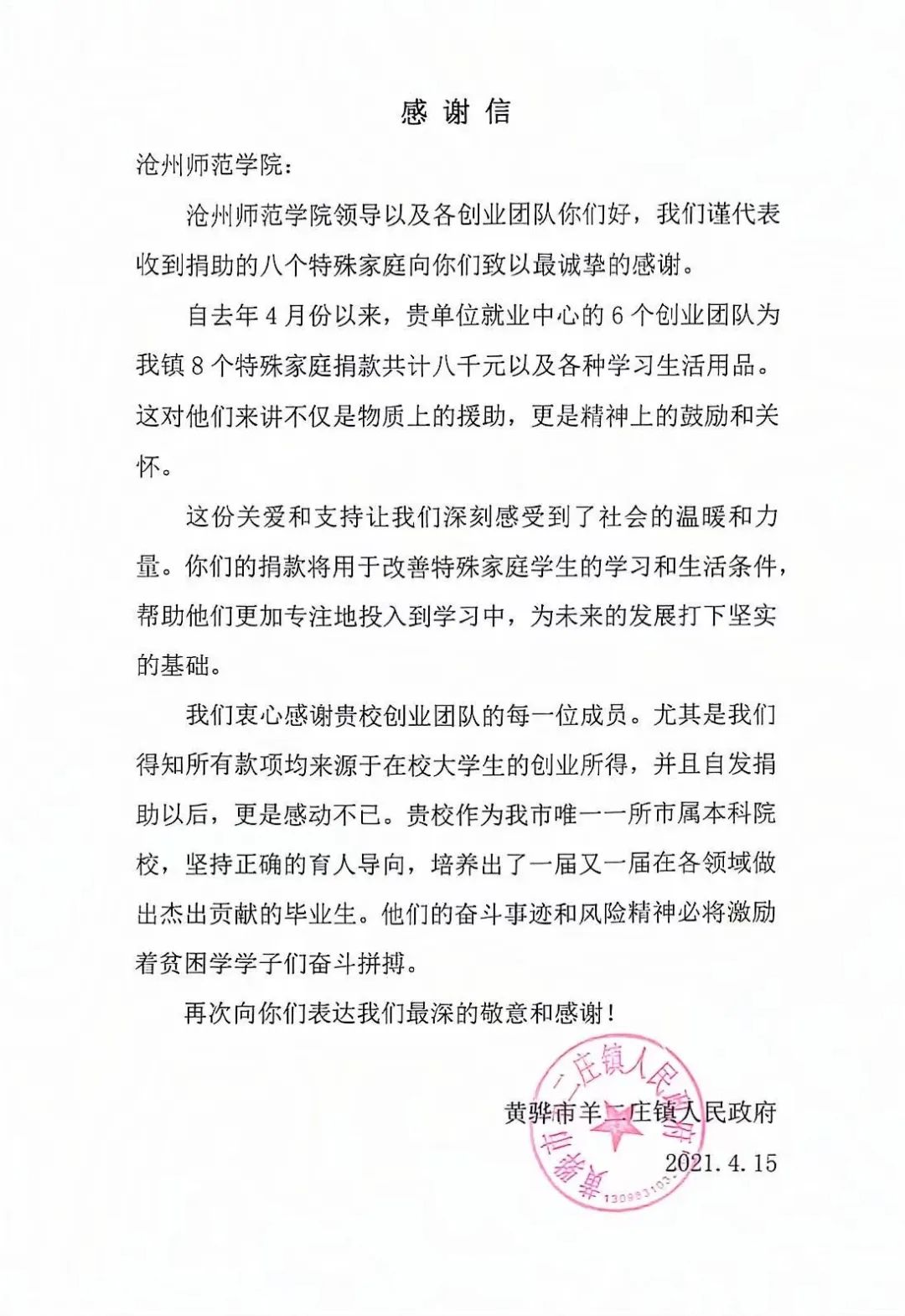 黄骅市羊二庄镇人民政府向太阳集团发来了感谢信,对太阳集团学生的奉献精神表示感谢,对太阳集团的育人成果表示高度肯定。受助学生和家长们纷纷表示一定会努力克服生活中的困难,做对社会有用的人。