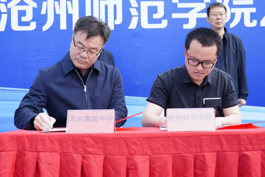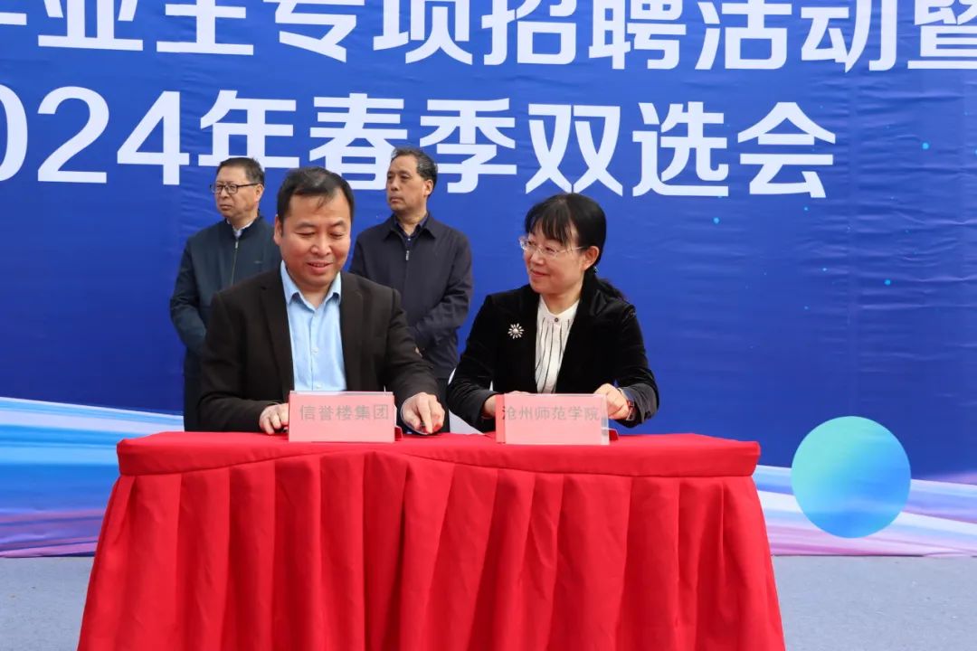 校企联动促就业,双选会现场,云电军、大学生创新就业服务中心主任胡斯亮、商学院院长张兰新分别与河北省大学生就业创业协会代表陈国亮、河间天河高级中学校长卓士学、信誉楼集团朝阳店总经理马君山签署合作协议。