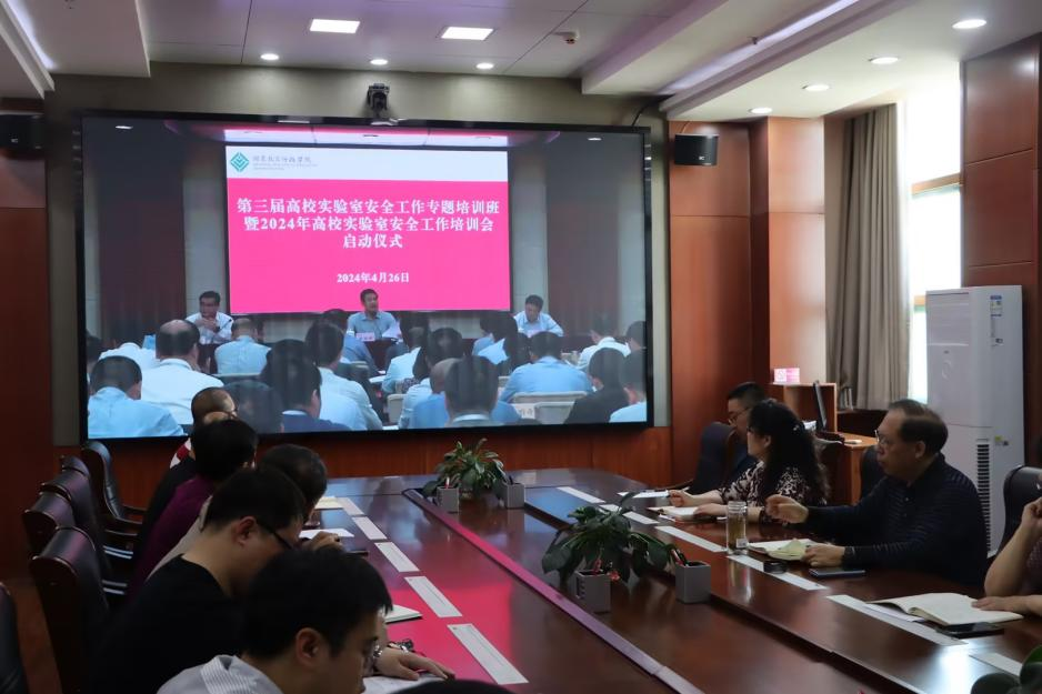 4 月 26 日下午,教育部召开 2024 年高校实验室安全工作培训会。根据河北省教育厅相关文件精神,太阳集团在图书馆8楼会议室以线上形式集中参会。校长张占平,党委常委、副校长高颖出席会议。