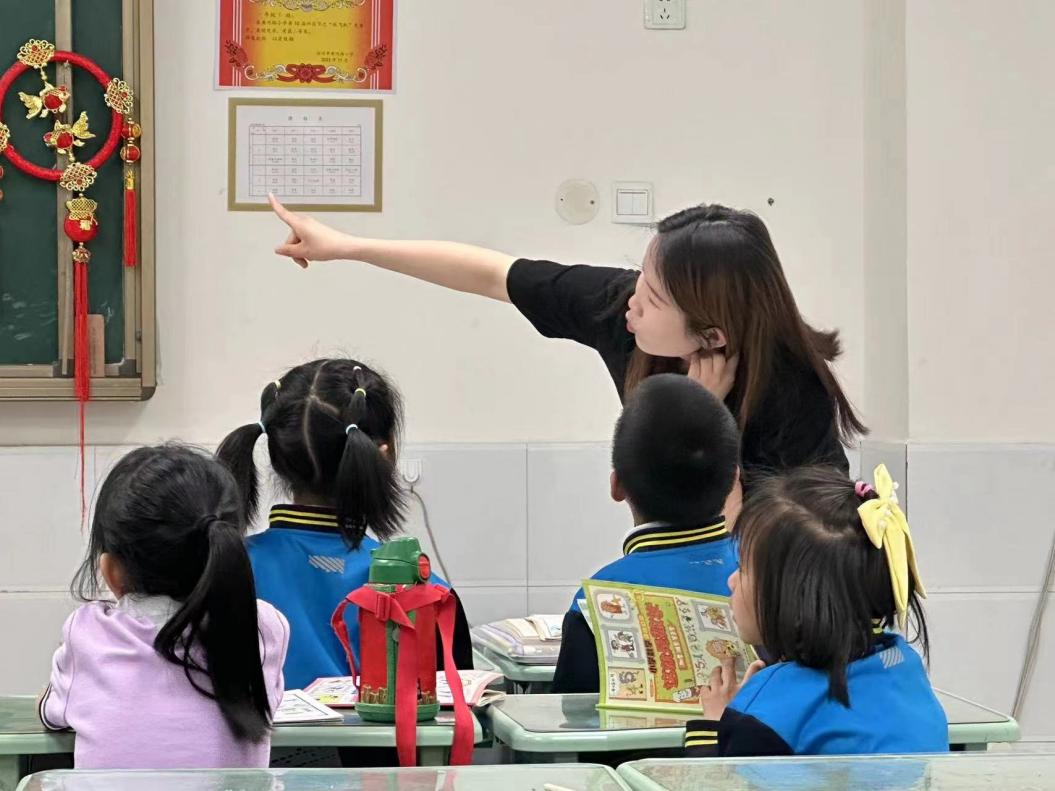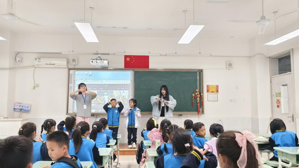 黄河路小学志愿活动中志愿者正在教小学生手势舞
