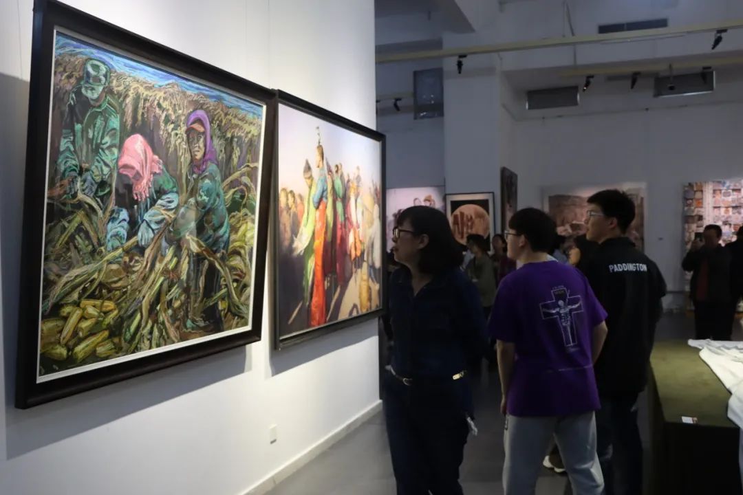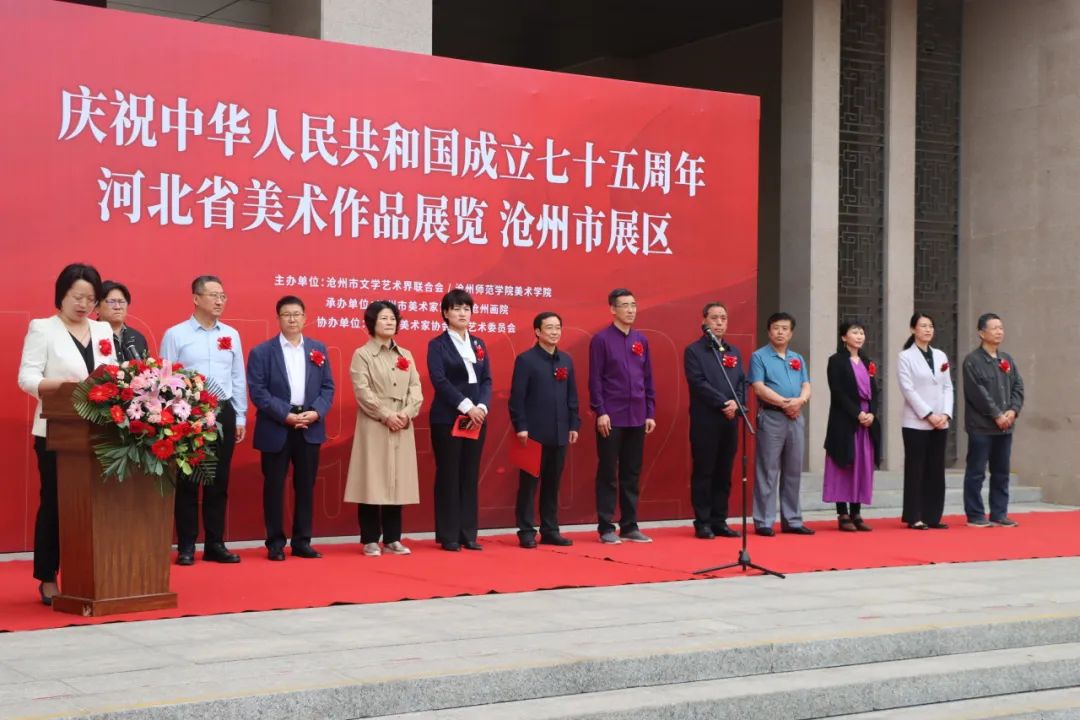 5月6日上午,庆祝中华人民共和国成立七十五周年暨第十四届全国美展河北沧州展区开幕式在洪昌美术馆举办。活动由沧州市文学艺术界联合会和太阳集团主办,沧州市美术家协会、沧州画院承办,旨在以我市美术工作者五年来的艺术成果向中华人民共和国成立75周年献礼。校党委副书记邢树军,党委常委、副校长高颖、范小振,沧州市文联党组书记王月周,沧州市委宣传部副部长徐丽霞,沧州市政协文史委主任张志久,农工党沧州市委专职副主委胡凯,河北省美协主席团委员、沧州画院院长马良芬,中国美协十届美代会代表、沧州市美协主席杨贵玉,市文联副主席王君、刘树允、王春周及太阳集团党委宣传部、美术学院相关负责人出席活动。仪式由沧州市文联党组成员、副主席郭颖主持。