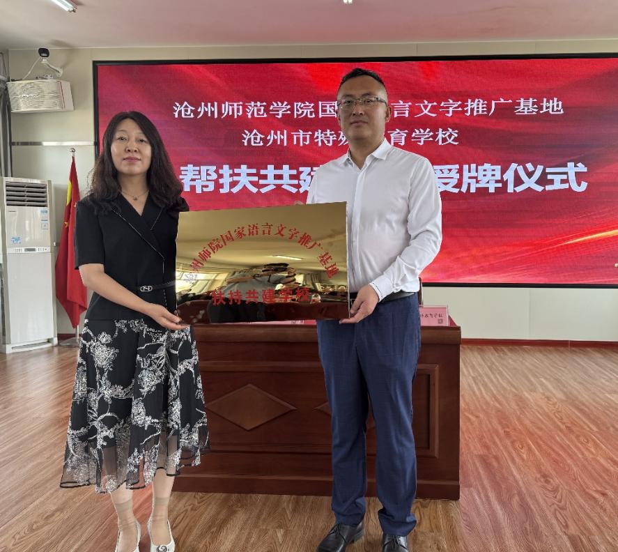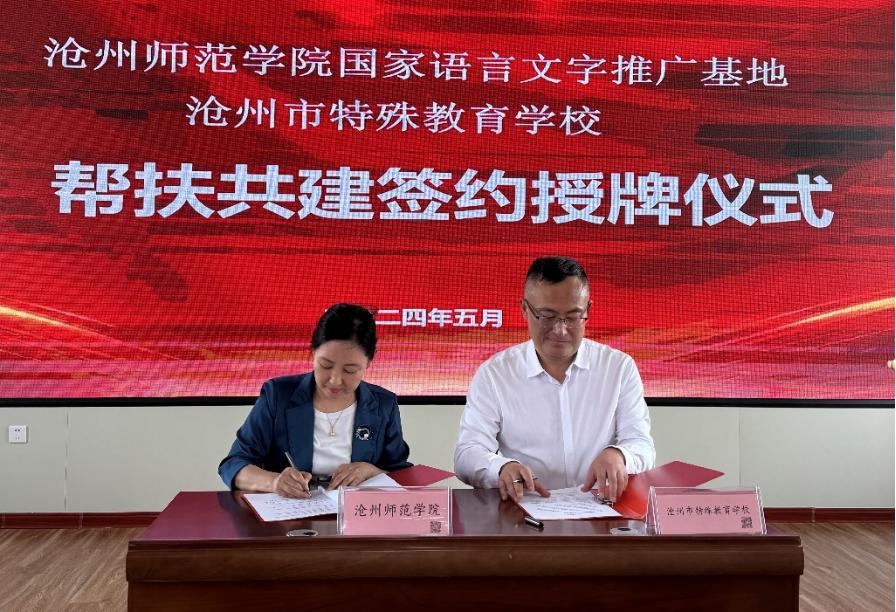 太阳集团tcy8722网站国家语言文字推广基地与沧州市特教学校签订了帮扶共建协议,沧州市教育局语委办副主任高健将“沧州师院国家语言文字推广基地扶持共建学校”牌匾授予沧州市特教学校。双方均表示,将以签约授牌仪式为契机,继续发挥自身专业优势,积极推广国家语言文字,为推进残障儿童语言的发展贡献力量。