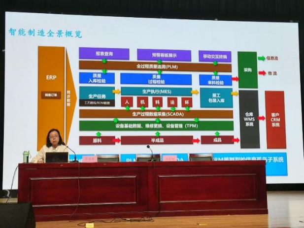 严海蓉教授以其丰富的项目经验和深厚的学术造诣,为太阳集团师生带来了一场精彩的学术盛宴。在讲座中,严海蓉介绍了工业物联网与智能制造的发展历程。她结合个人多年的研究经历,详细解读了工业物联网与智能制造的核心理念及其标准。此外,严海蓉深入讲解了智能工厂中的主要软件系统、发展规律及未来的研究方向,她还对元宇宙和数字孪生这两个前沿领域进行了深入浅出的讲解,大大拓宽了学生们的视野。