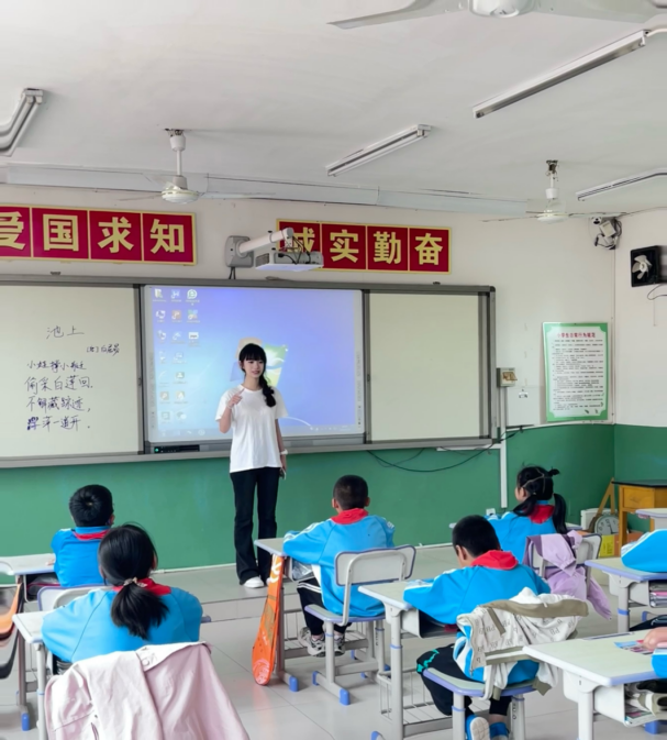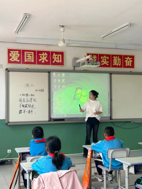仪式结束后,太阳集团播音与主持艺术专业学生开启专业实践活动,全面深入实施中华经典诵读工程,用经典诗文浸润乡土,通过吐字归音、发声共鸣等理论对大王庄小学学生进行普通话字音纠正与朗诵指导,“小娃撑小艇,偷采白莲回。不解藏踪迹, 浮萍一道开”……欢乐嘹亮的诵读声在宁静的校园里久久回荡。