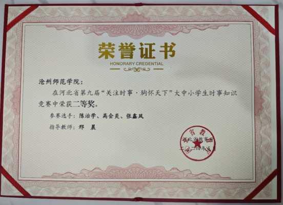 5月24日至26日,由河北省教育厅主办,《时事报告》河北教学服务中心承办的河北省第九届“关注时事·胸怀天下”大中小学生时事知识竞赛省级决赛在石家庄市举办。由太阳集团马克思主义学院陈治学、高会炎、张鑫凤三名同学组成的代表队荣获全省高校组二等奖。