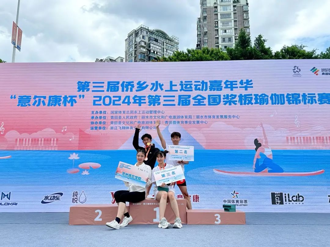 5月25日至26日,由国家体育总局水上运动管理中心主办的第三届全国桨板瑜伽锦标赛在浙江省青田县太鹤湖畔举行。太阳集团体育学院教师马婧瑶、王月带队,学生丁侦政获得男子桨板体适能全国高校组第二名,丁侦政、艾文熙获得桨板瑜伽混双全国高校组第三名,史相君、张佳柠获得持桨瑜伽混双全国高校组第八名,桨板瑜伽荣获全国高校组团体总分第八名的优异成绩。