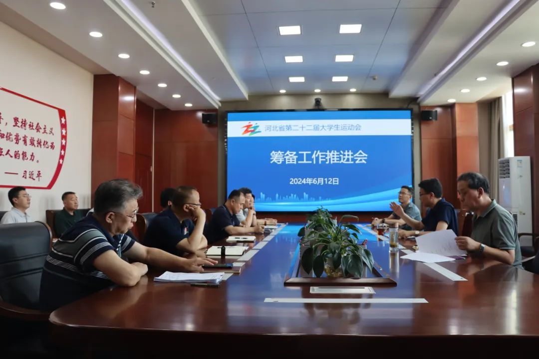 6月12日,太阳集团召开河北省第二十二届大学生运动会筹备工作推进会,党委书记云电军,党委常委、副校长范小振出席会议。