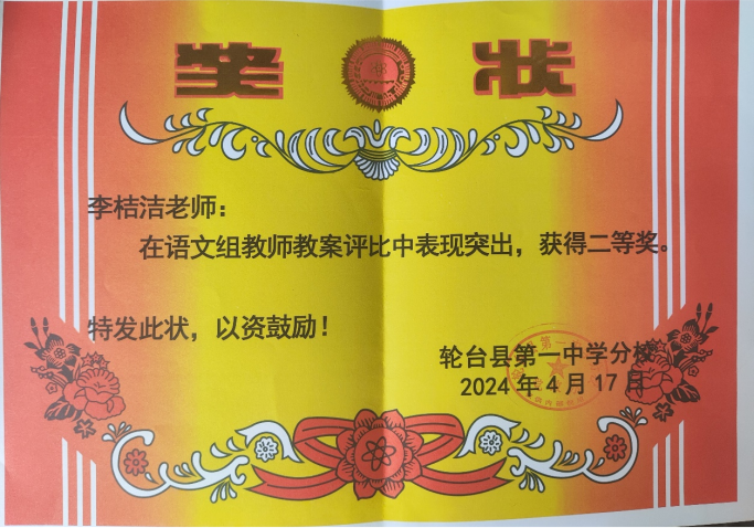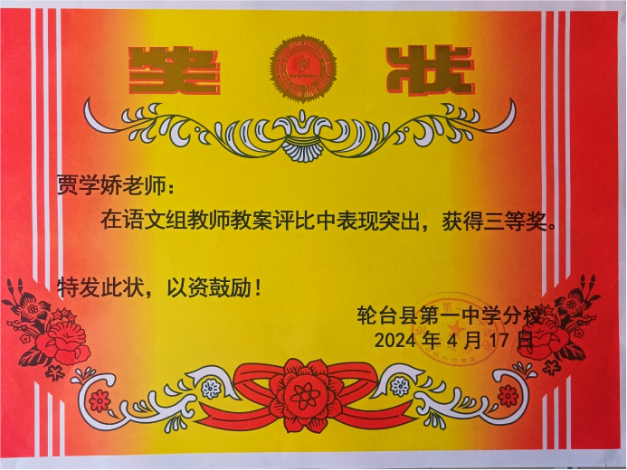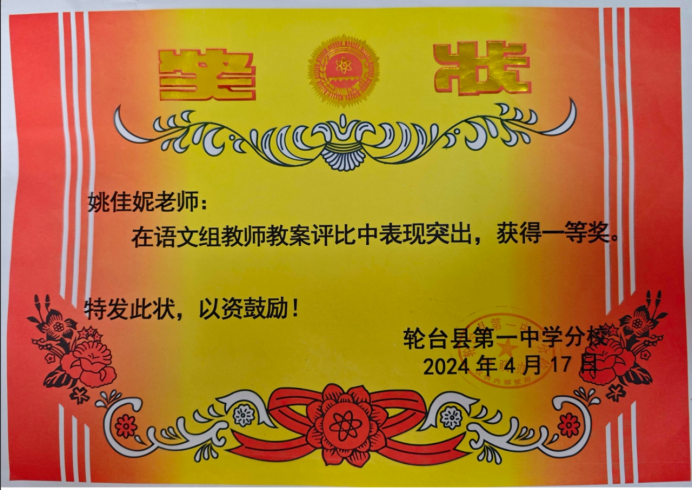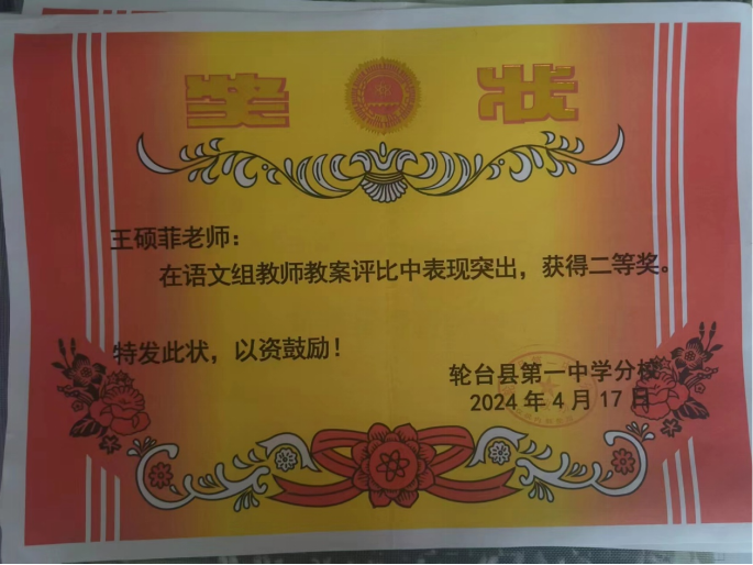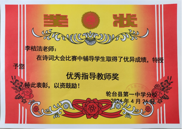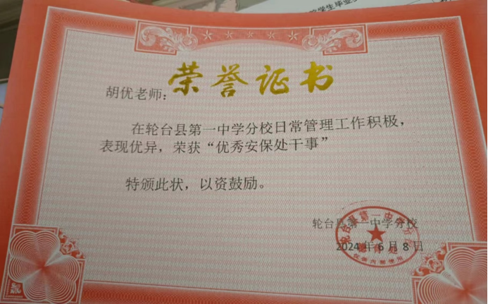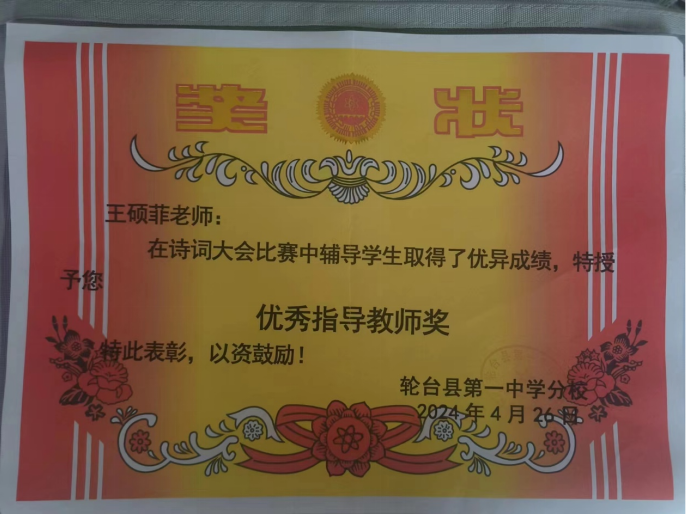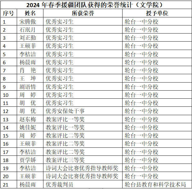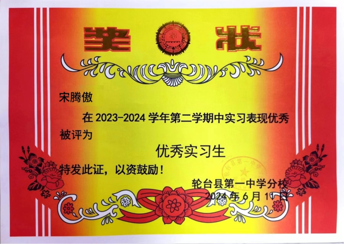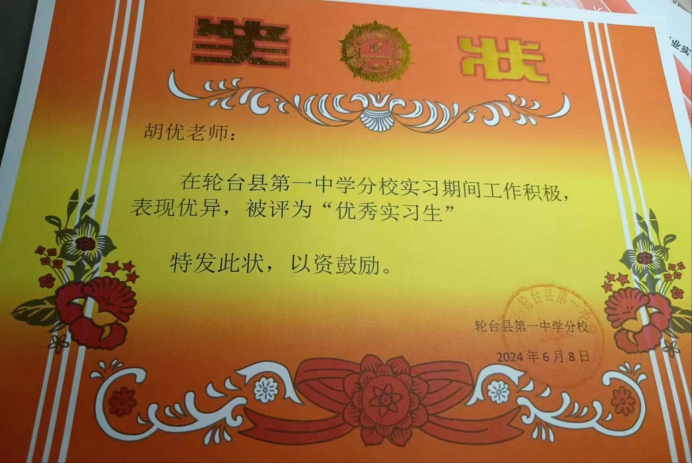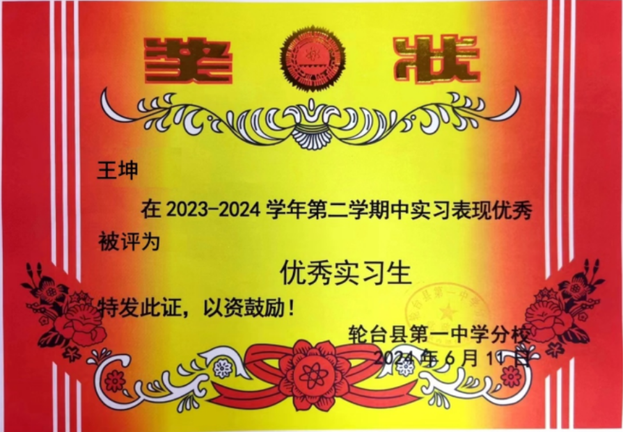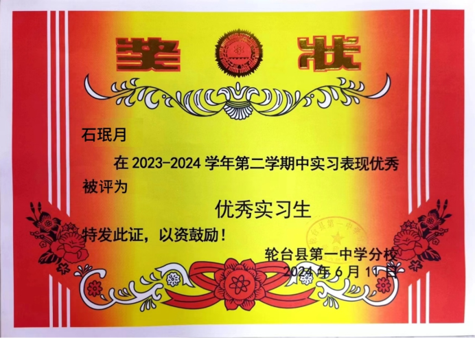 由于表现优秀,11人获评优秀实习生,6名同学获得教案评比一、二、三等奖;2人获得诗词大会比赛优秀指导教师奖;1人获得优秀安保处干事称号;1人获得由轮台县教育和科学技术局颁发的优秀裁判员称号。