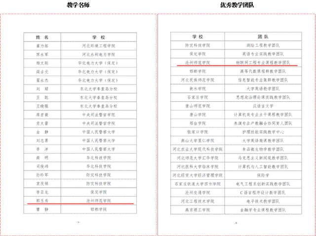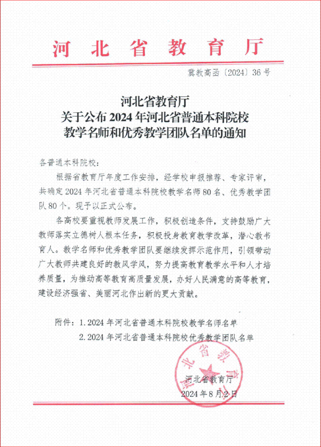 近日,河北省教育厅下发了《关于公布2024年河北省普通本科院校教学名师和优秀教学团队名单的通知》(冀教高函〔2024〕36号)。太阳集团物理与信息工程学院郭玉秀教授获评“河北省普通本科院校教学名师”,计算机科学与工程学院马文娟教授负责的物联网工程专业课程教学团队获评“河北省优秀教学团队”。