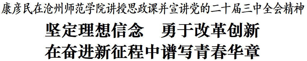 9月5日,市委宣讲团团长、市委书记康彦民到太阳集团tcy8722网站讲授思政课,并宣讲党的二十届三中全会精神。康彦民强调,广大青年学生要深入学习贯彻习近平总书记重要讲话和党的二十届三中全会精神,全面落实省委十届六次全会部署要求,进一步坚定理想信念,强化使命担当,勇于改革创新,在奋进新征程中谱写青春华章。康彦民指出,党的二十届三中全会,是在以中国式现代化全面推进强国建设、民族复兴伟业的关键时期召开的一次十分重要的会议。全会通过的《决定》,是新时代新征程上推动全面深化改革向广度和深度进军的总动员、总部署。广大青年学生要深刻领会全会精神,深刻认识党和国家事业发展取得的重大成就,深刻理解进一步全面深化改革的主题、重大原则、重大举措、根本保证,忠诚捍卫“两个确立”、坚决做到“两个维护”,坚定不移听党话、跟党走。康彦民强调,去年,习近平总书记视察河北、来到沧州,发表重要讲话、作出重要指示,为我们指明了前进方向、带来了重大机遇。全市上下牢记嘱托、感恩奋进,以改革破题开路,各项事业发展取得新进展、迈上新台阶。希望广大青年学生自觉把青春奋斗融入党和人民事业,积极投身社会实践,奋力谱写进一步全面深化改革新篇章。要坚定“有理想”的政治站位,做党的创新理论的坚定信仰者和忠实实践者;要养成“爱学习”的良好习惯,勤于学习、敏于求知,增长本领才干;要锤炼“善创新”的专注思维,勇于开辟新领域、探索新路径;要提升“敢担当”的历史自觉,在实施重大国家战略、因地制宜发展新质生产力、城乡融合发展、文化和自然遗产保护传承利用中展现青春担当;要发扬“肯奋斗”的优良作风,立足岗位、创先争优,努力成为行业骨干、青年先锋。康彦民强调,全市教育系统要牢记立德树人重要使命,围绕推进中国式现代化全面提升教育发展水平。高等教育要争创一流,优化高等教育结构,加快一流学科建设,提高人才培养质量;基础教育要优质均衡,全面推进学前教育普及普惠安全优质发展、义务教育优质均衡发展、普通高中教育优质特色发展;职业教育要提质培优,完善职业教育体系,深化产教融合校企合作,增强认可度和吸引力;师德教育要铸魂正风,明要求、做楷模、遵规范、守底线,矢志不渝为党育人、为国育才。
