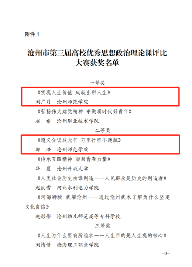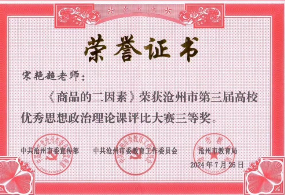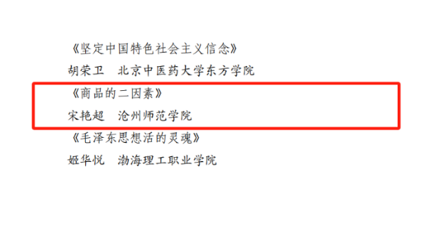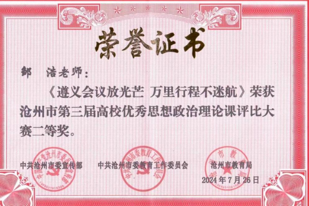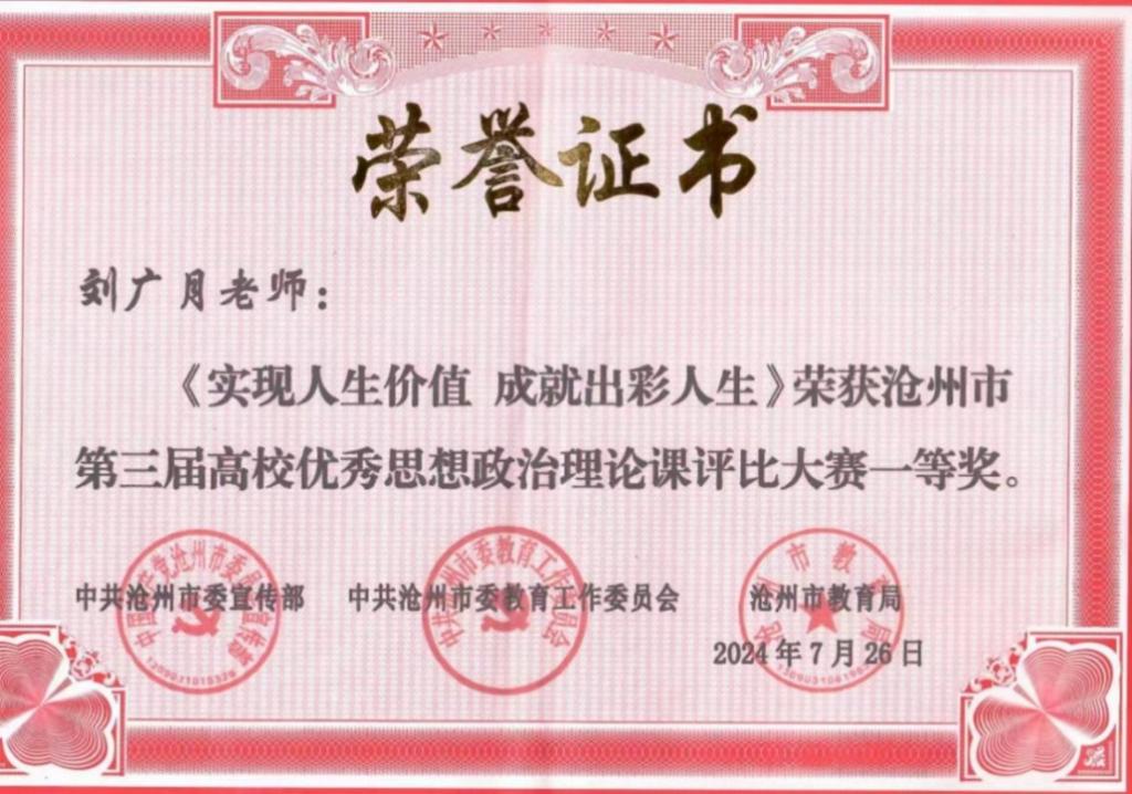 近日,由市委宣传部、市委教育工委、市教育局联合举办的沧州市第三届高校优秀思想政治理论课评比大赛成绩揭晓,在来自11所高校的21名思政课教师进行的决赛中,太阳集团马克思主义学院教师刘广月荣获一等奖、邹浩荣获二等奖、宋艳超荣获三等奖。