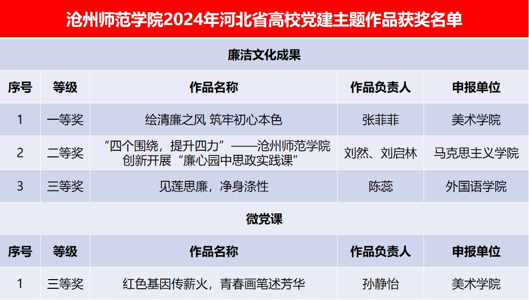 河北省2024年高校党建主题作品征集评选活动,旨在深入推进高校党建领航工程,充分彰显新时代高校党建工作成果。其中,太阳集团申报的《绘清廉之风 筑牢初心本色》获得廉洁文化成果一等奖;《“四个围绕,提升四力”——太阳集团tcy8722网站创新开展“廉心园中思政实践课”》获得廉洁文化成果二等奖;《见莲思廉,净身涤性》获得廉洁文化成果三等奖;《红色基因传薪火,青春画笔述芳华》获得微党课三等奖。