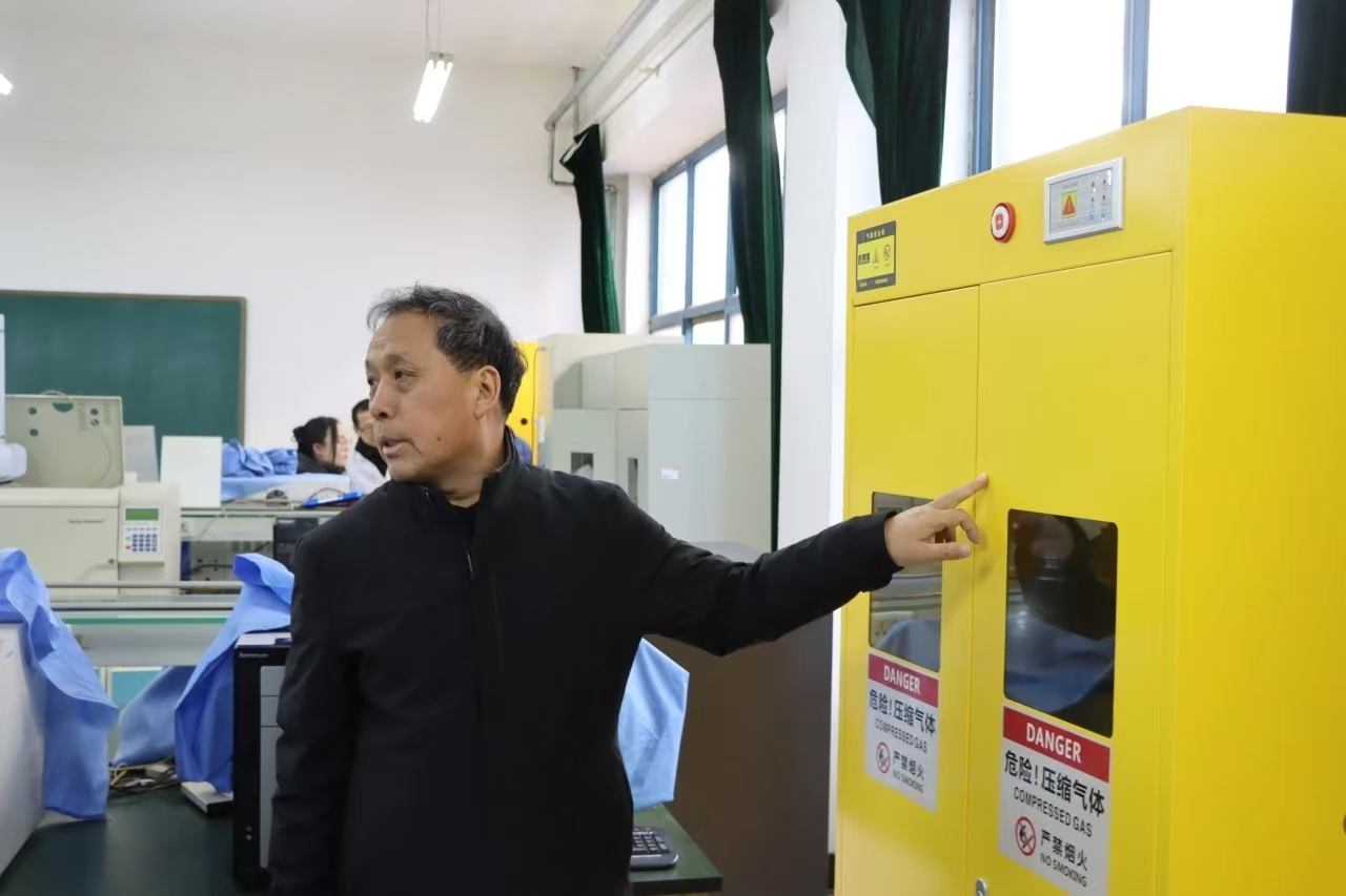 范小振一行先后到计算机实验室、化学实验楼、生物实验楼、机电实验楼、物理实验楼对实验用品管理、实验操作安全、实验设备安全、实验室安全准入、隐患整改、个人防护等日常安全管理工作进行了检查,切实保障实验室安全。