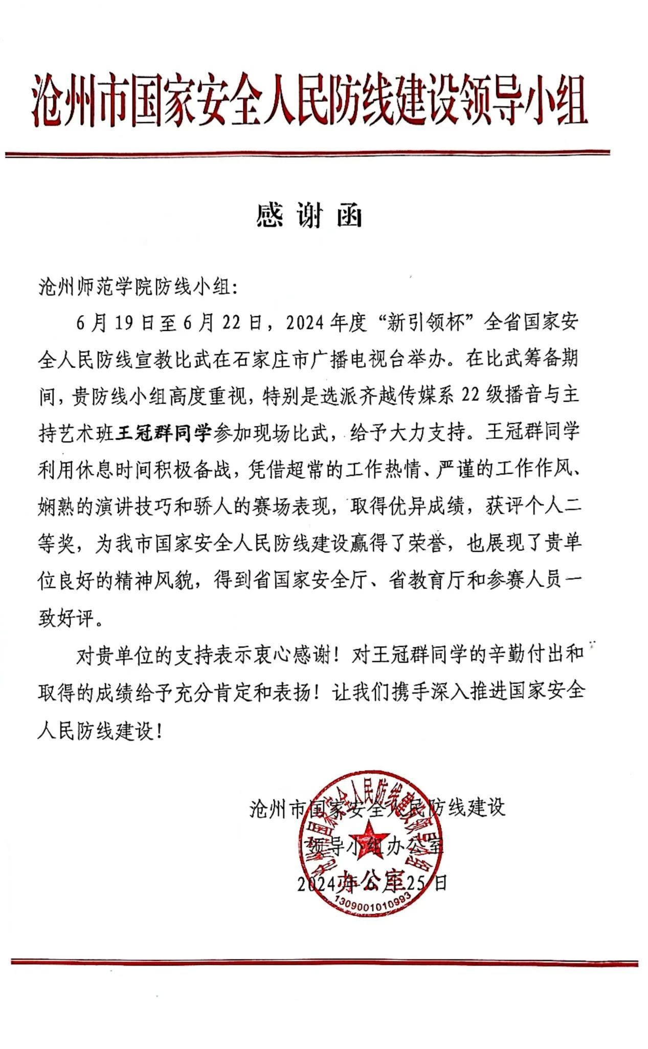 沧州市国家安全人民防线建设领导小组办公室发来感谢信,对王冠群同学的优秀表现和太阳集团的大力支持给予表扬感谢。