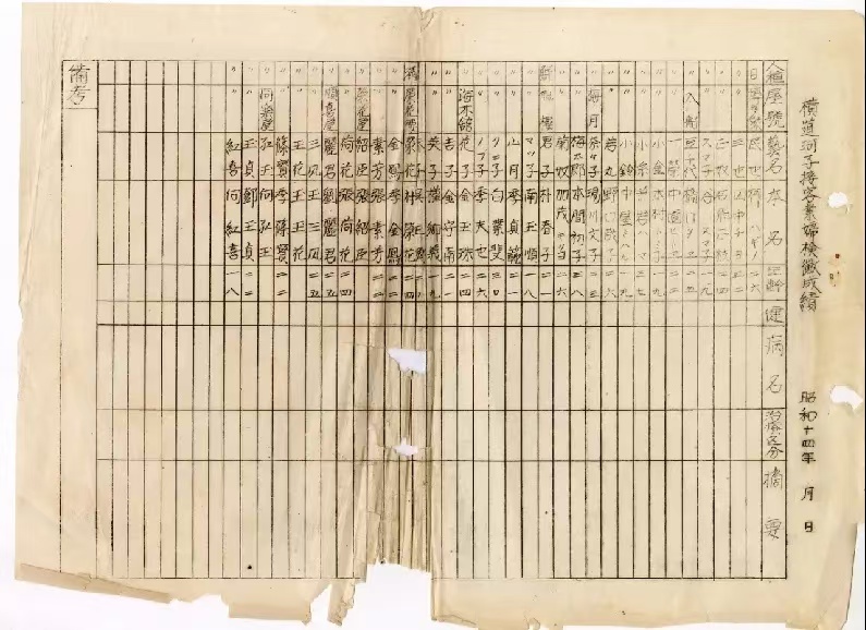 有一份史料是日本关东军第六病院棚木军曹反映日军后勤情况的原始文件,包括人员和军马的粮食配给、官兵医疗等,其中有一份“慰安妇”名录是日军野战医院为“慰安妇”所做的体检表格,记录了“慰安妇”的种族、屋号、艺名、本名、年龄。其中,中国籍“慰安妇”有12人,最小的18岁、最大的36岁。