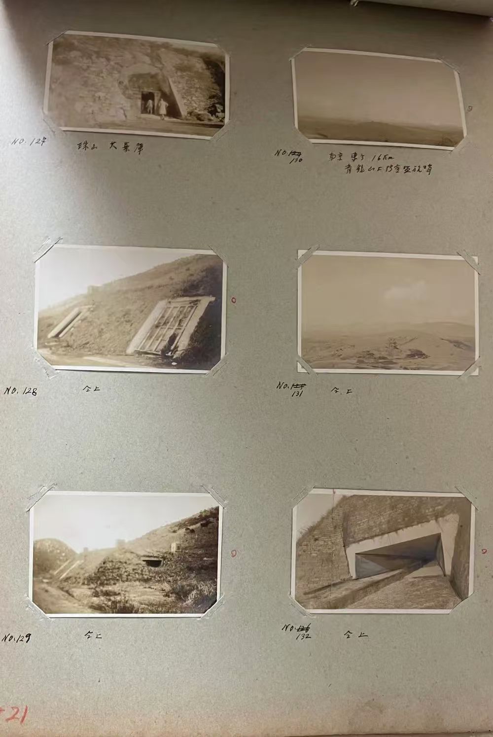 另一本相册里则是150多张南京沦陷期间侵华日军拍摄的中国守军在南京建设的防空设施的相关照片,照片下方几乎都有相应注释及编码。照片中的不少防空设施,如珠山弹药库、青龙山监视哨等属当时南京的绝密工程。以几张青龙山监视哨的照片为例,有远景有近景,照片下方除编码外,还写着“南京 东方 16km 青龙山上防空监视哨”的字样。