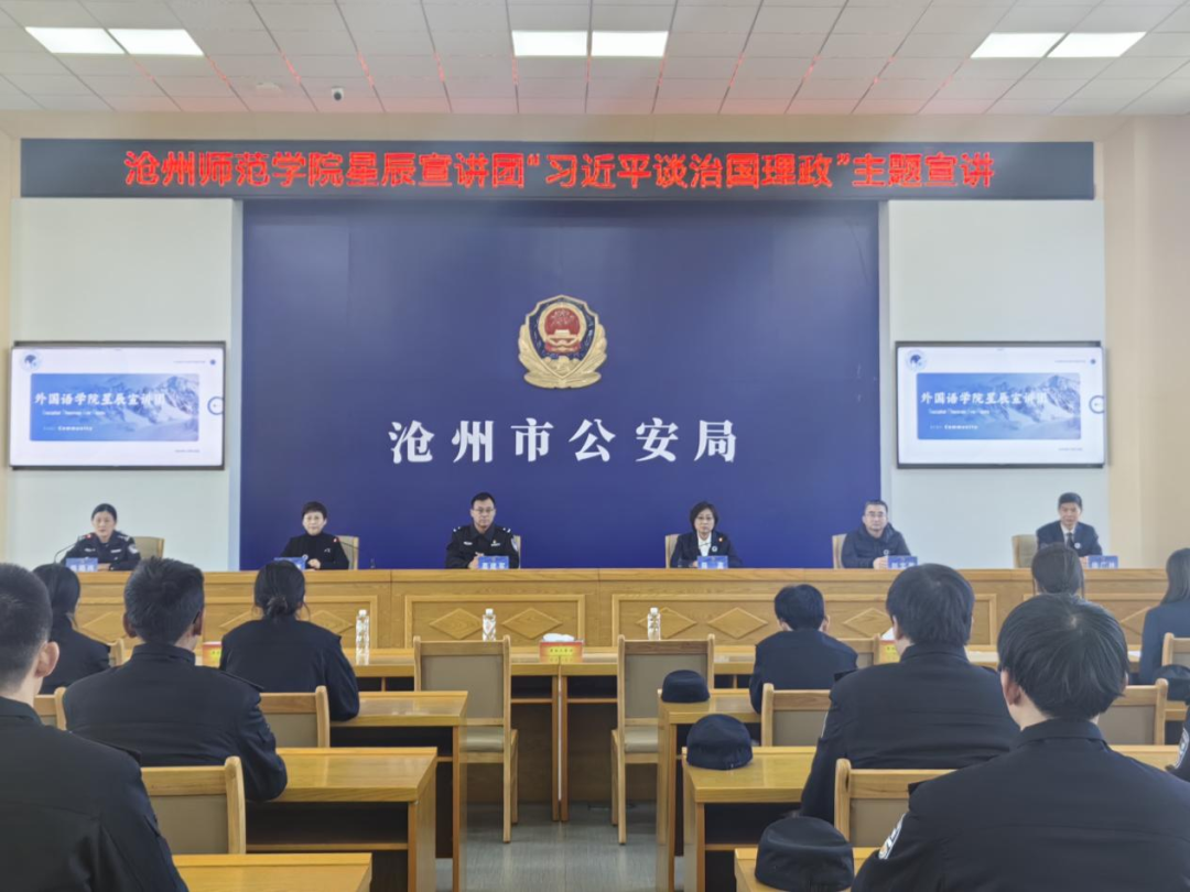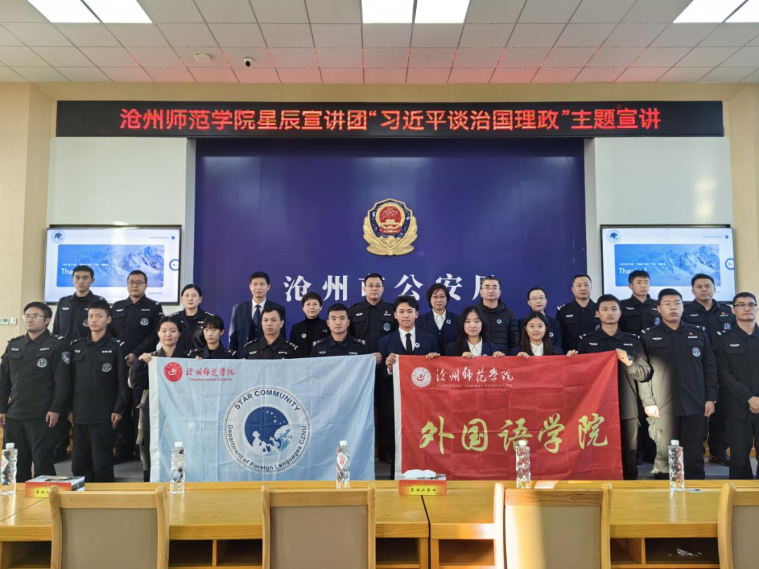 12月18日下午,外国语学院“星辰宣讲团”走进沧州市公安局特警支队,为民辅警们带来了习近平强军思想主题宣讲。沧州市公安局特警支队党委书记、支队长葛建军,党委委员、政办室主任韩晓玮,政治处主任陈笑热情迎接。