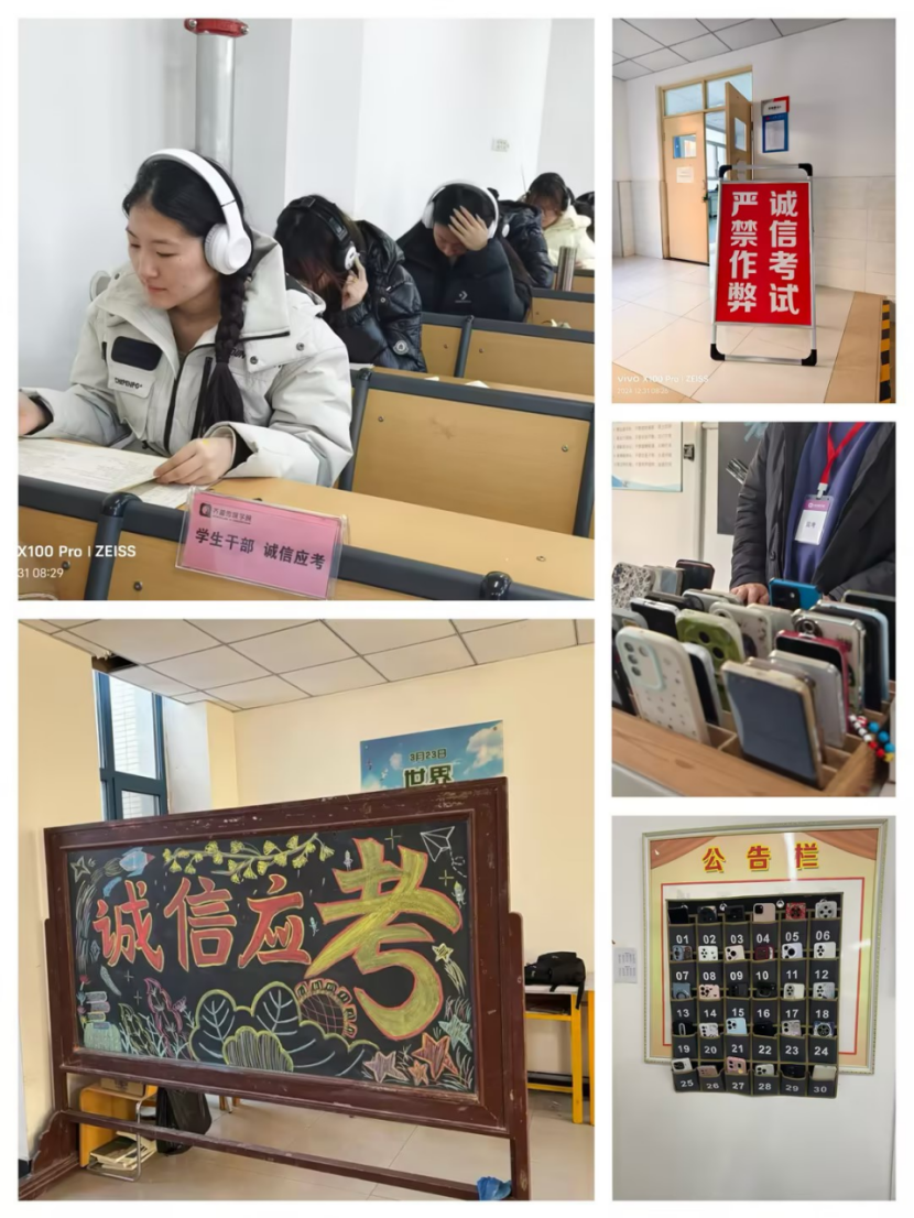 校级督导专家们全力投入到细致入微的巡视工作中,聚焦考场布置的各个环节,从手机管控、书包摆放的规整,到诚信考试宣传张贴的醒目与否,皆细细审视;考风考纪是巡查的核心要点,督导专家们时刻留意考场内的细微动态,全力维护考试的公平公正;教师监考职责的履行情况也在严密的考察范围内,从准时到岗的坚守,到监考全程的专注负责,均严格把关;学生干部示范引领作用的发挥同样成为督导重点,他们在诚信考试风尚倡导示范等方面的表现,亦是本次督导的关键看点。